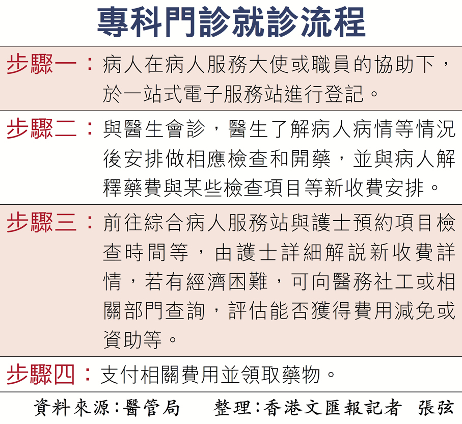 香港文匯報日前受邀參觀公營醫療收費改革後專科門診的模擬就診流程,包括模擬病人登記、診症及就診後加強支援病人的一系列安排。整個就診流程大致與現時相同,主要區別是醫生和護士會跟病人詳細講解所涉及的新收費詳情,包括診症費、藥費、某些檢查項目的費用等。若病人有經濟困難,護士會建議病人向醫務社工或相關部門查詢,評估能否獲得費用減免或資助等。