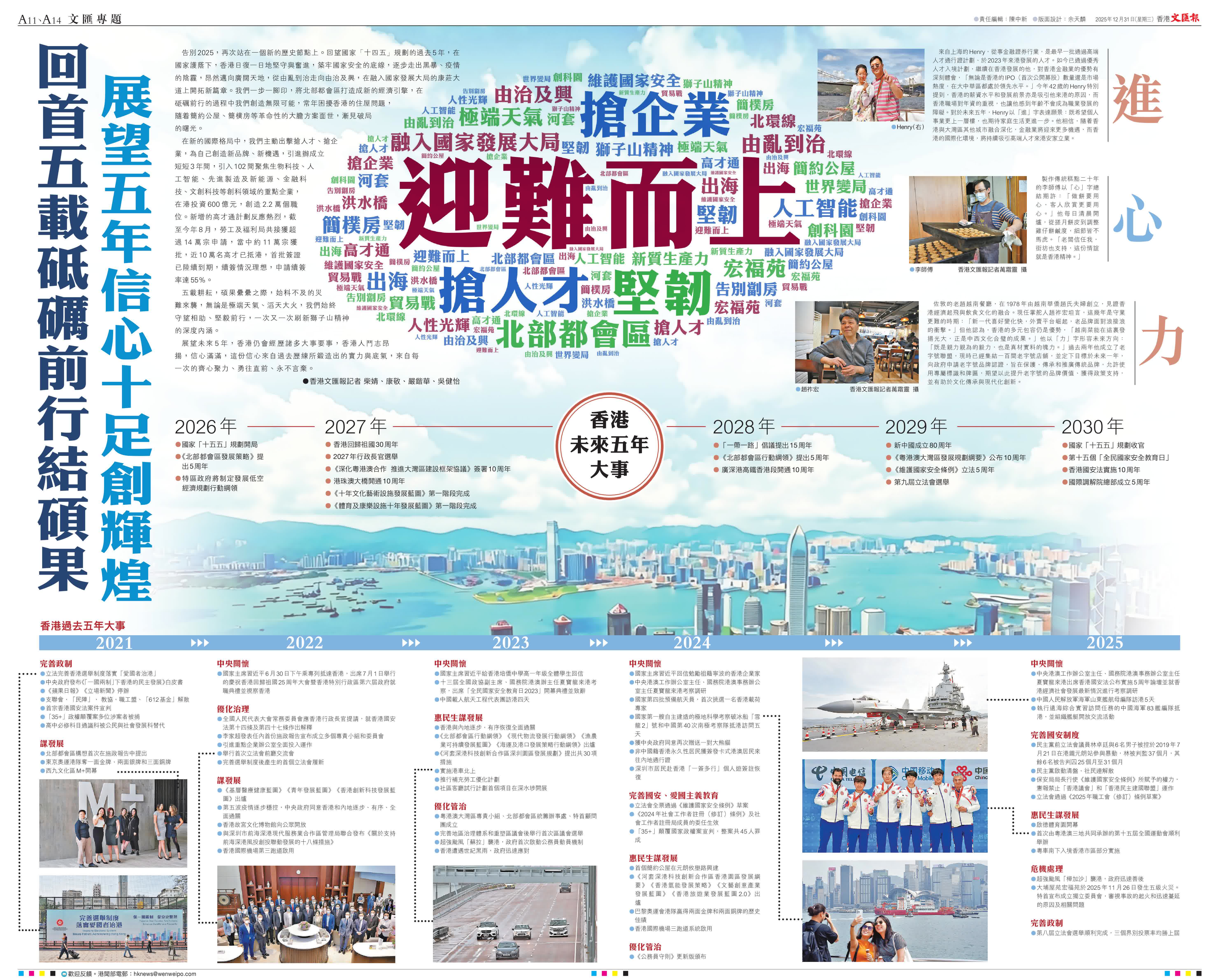 (香港文匯報記者 柴婧、康敬、嚴鍇華、吳健怡)告別2025,再次站在一個新的歷史節點上。回望國家「十四五」規劃的過去5年,在國家護蔭下,香港日復一日地堅守與奮進,築牢國家安全的底線,逐步走出黑暴、疫情的陰霾,昂然邁向廣闊天地,從由亂到治走向由治及興,在融入國家發展大局的康莊大道上開拓新篇章。我們一步一腳印,將北部都會區打造成新的經濟引擎,在砥礪前行的過程中我們創造無限可能,常年困擾香港的住屋問題,隨着簡約公屋、簡樸房等革命性的大膽方案面世,漸見破局的曙光。
