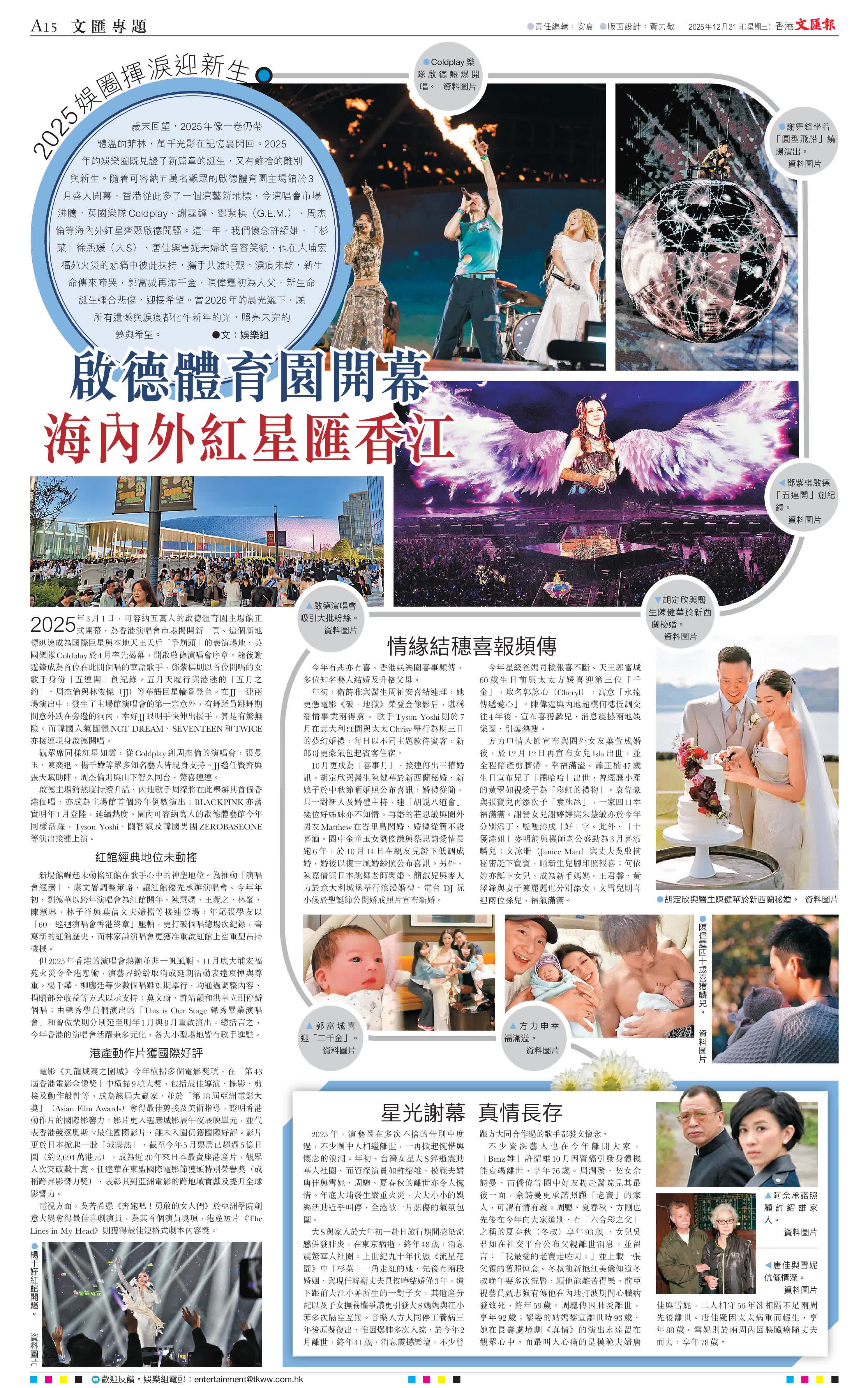 (香港文匯報娛樂組)歲末回望,2025年像一卷仍帶體溫的菲林,萬千光影在記憶裏閃回。2025年的娛樂圈既見證了新篇章的誕生,又有難捨的離別與新生。隨着可容納五萬名觀眾的啟德體育園主場館於3月盛大開幕,香港從此多了一個演藝新地標,令演唱會市場沸騰,英國樂隊Coldplay、謝霆鋒、鄧紫棋(G.E.M.)、周杰倫等海內外紅星齊聚啟德開騷。這一年,我們懷念許紹雄、「杉菜」徐熙媛(大S)、唐佳與雪妮夫婦的音容笑貌,也在大埔宏福苑火災的悲痛中彼此扶持,攜手共渡時艱。淚痕未乾,新生命傳來啼哭,郭富城再添千金,陳偉霆初為人父,新生命誕生彌合悲傷,迎接希望。當2026年的晨光灑下,願所有遺憾與淚痕都化作新年的光,照亮未完的夢與希望。