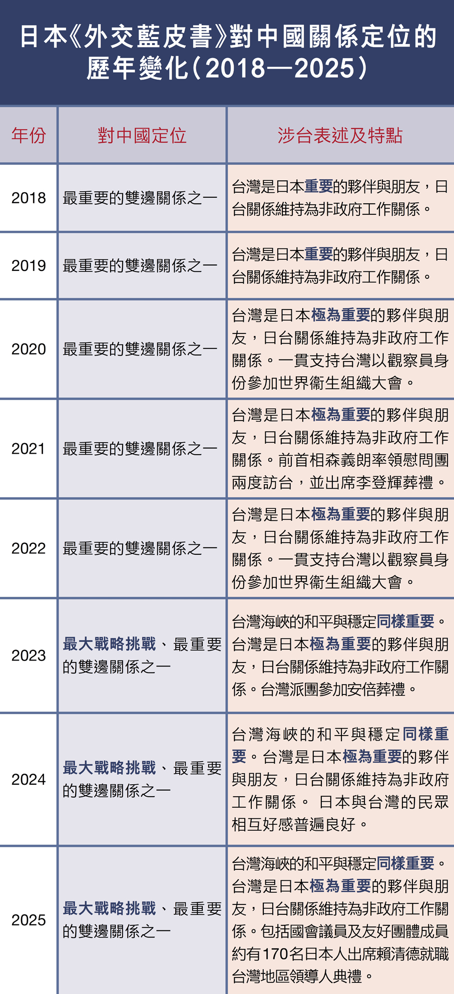 2023年日本《外交藍皮書》雖將中日關係表述為 「最重要的雙邊關係之一」,但也首次明確提及「中國是日本和平安全的最大戰略挑戰」,「台海和平對日本同樣重要」,顯示日本已將台海議題納入本國安全戰略框架,並延續相關表述直至2025年日本《外交藍皮書》。於此同時,在此三年中,日本亦頻繁提及「台海和平對國際社會的重要性」,並於G7峰會中,試圖將台海問題國際化。