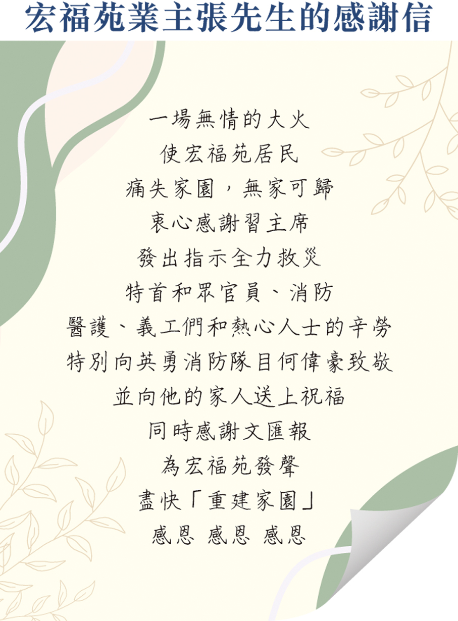 張先生一家四口生活在宏福苑宏道閣,自大火發生那天匆忙離開後便一去不能返,一家人先後在社區會堂、朋友住所及酒店暫住,社會各界無私的支持助他們挺過了顛沛流離的苦日子,其中「一戶一社工」更是他手機的置頂聯繫人之一,「幾乎每天都有聯絡,社工會提醒我要拿什麼援助,後來還幫我整理了援助資訊的表格。雖然她本身還有正職,但對我們的需求都很幫手。」就連入住的酒店,職員也是無微不至的關心,「一日三餐都在餐廳吃,完全沒有寄人籬下的感覺,反而是一種像家的溫暖。」