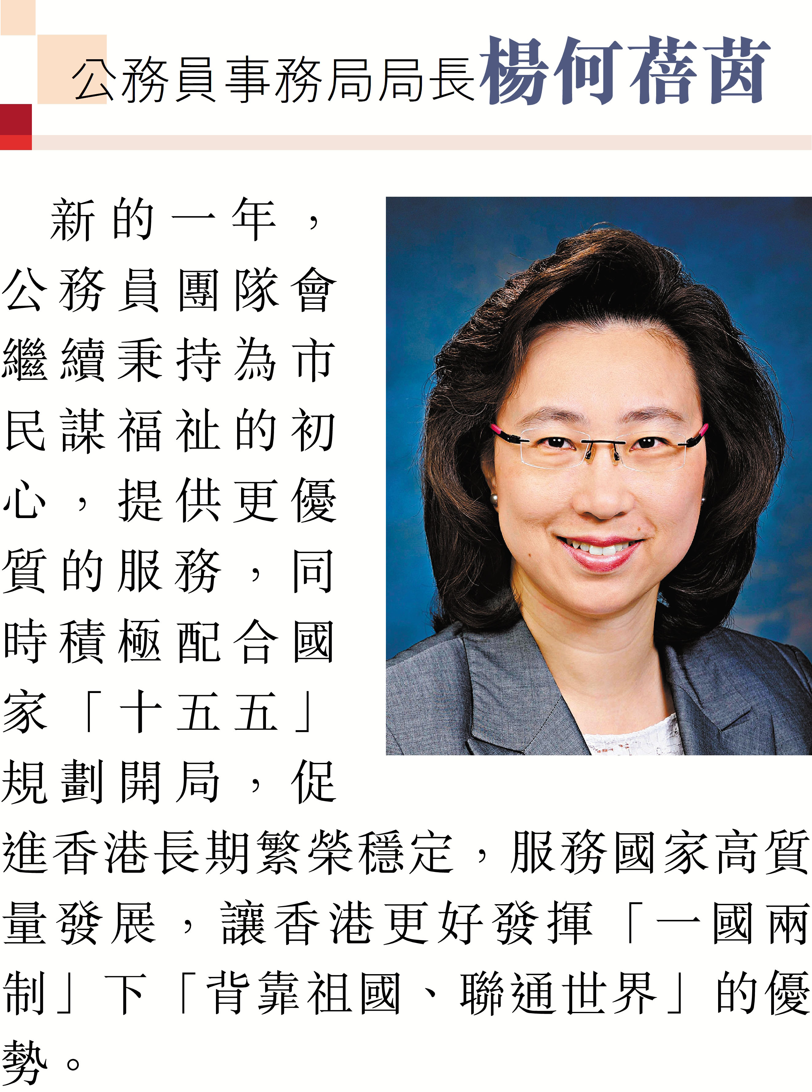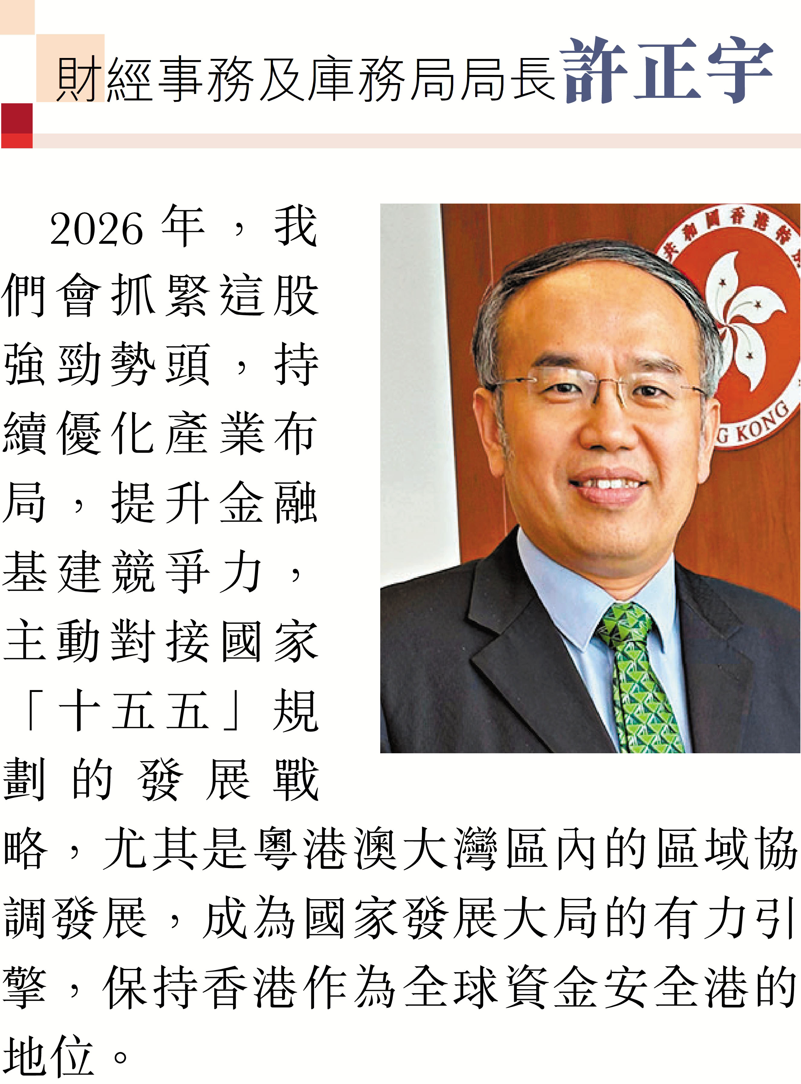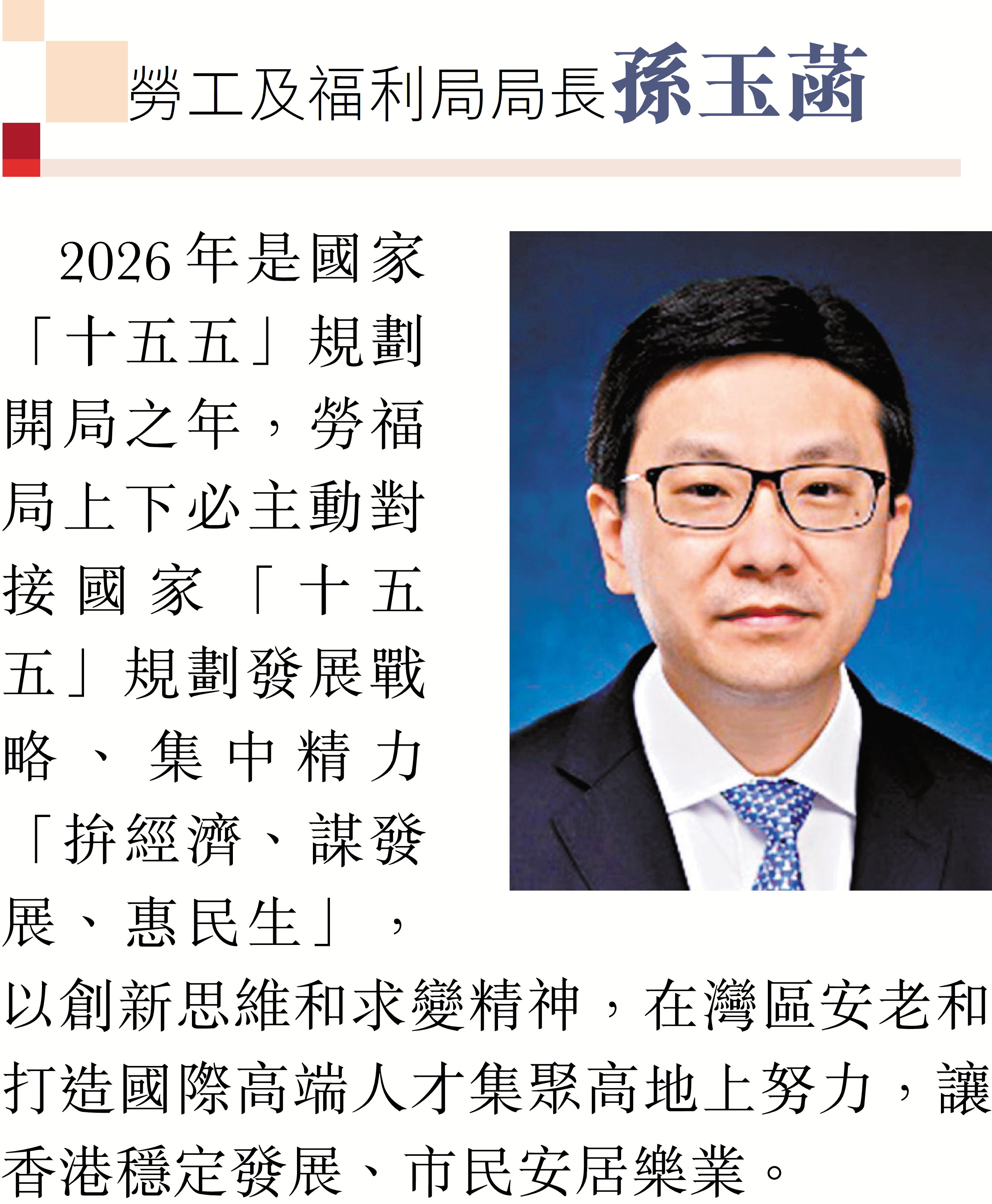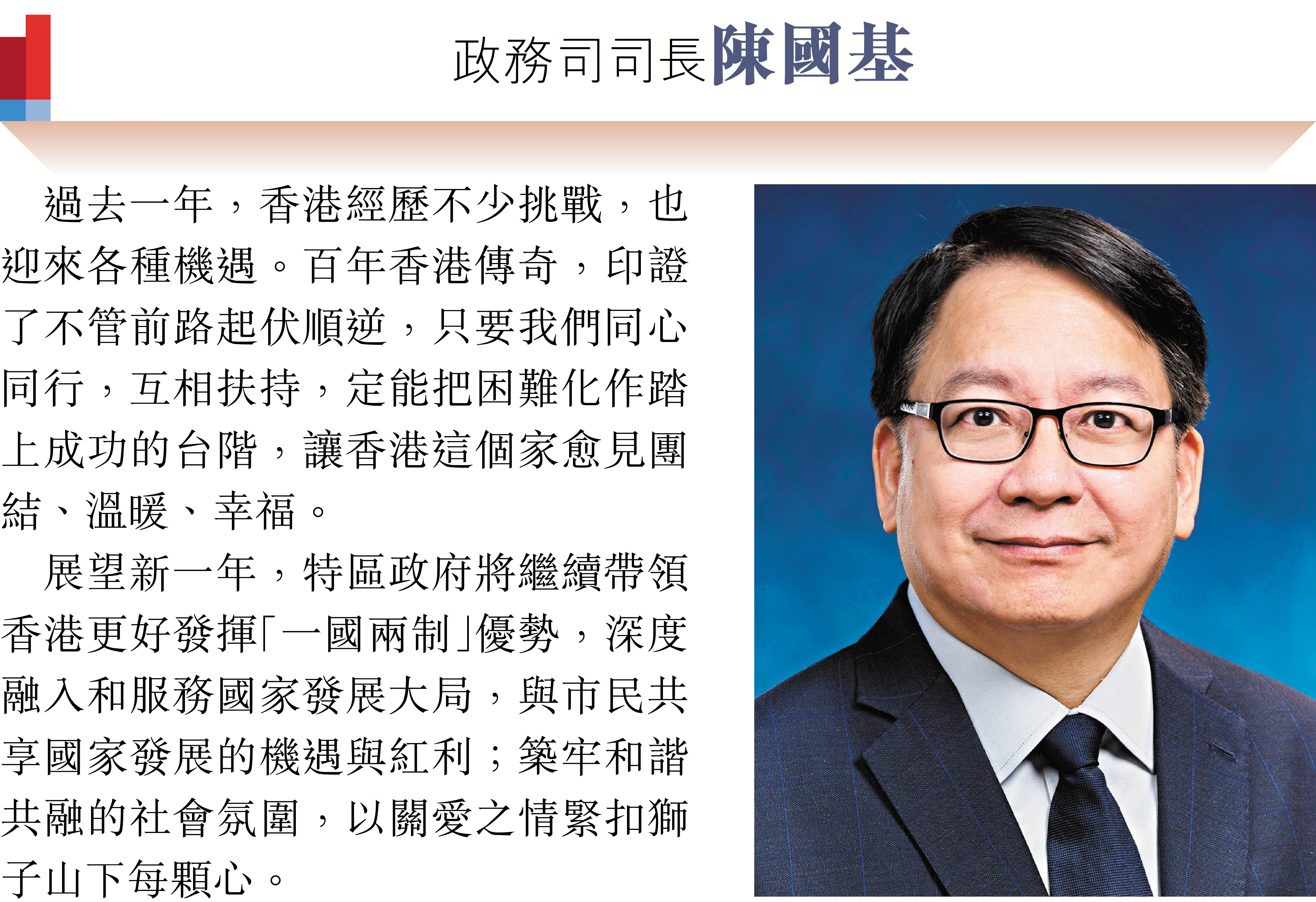 2026年元旦到來之際,香港特區行政長官李家超和特區政府司局長圍繞「同心同行、美好共創、安穩、社福同心、綠色轉型、發揮所長」等關鍵詞,向香港文匯報讀者送上誠摯的新年祝福。
