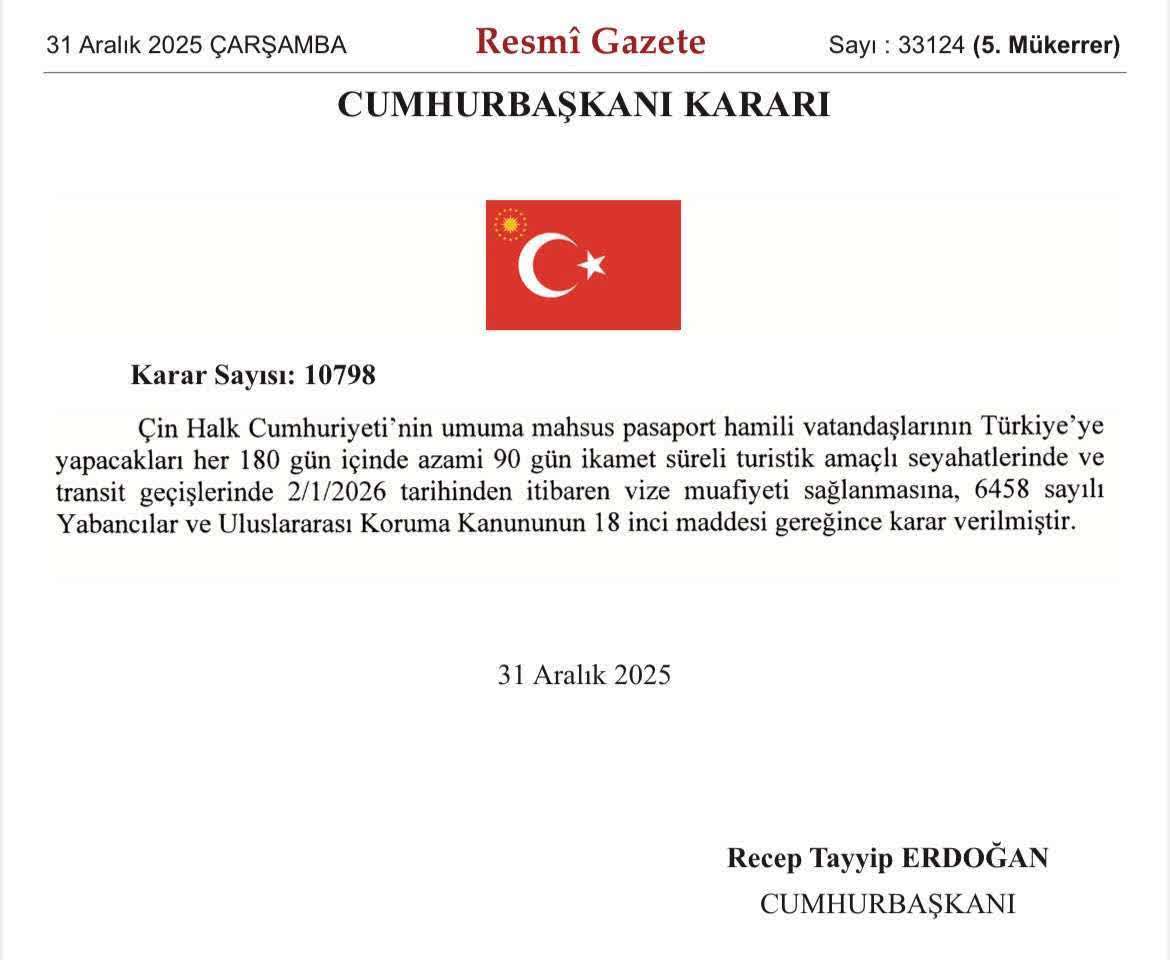 據央視新聞報道,當地時間12月31日,土耳其《官方公報》發布總統令,宣布自2026年1月2日起,對持中國普通護照的公民實行免簽入境政策。