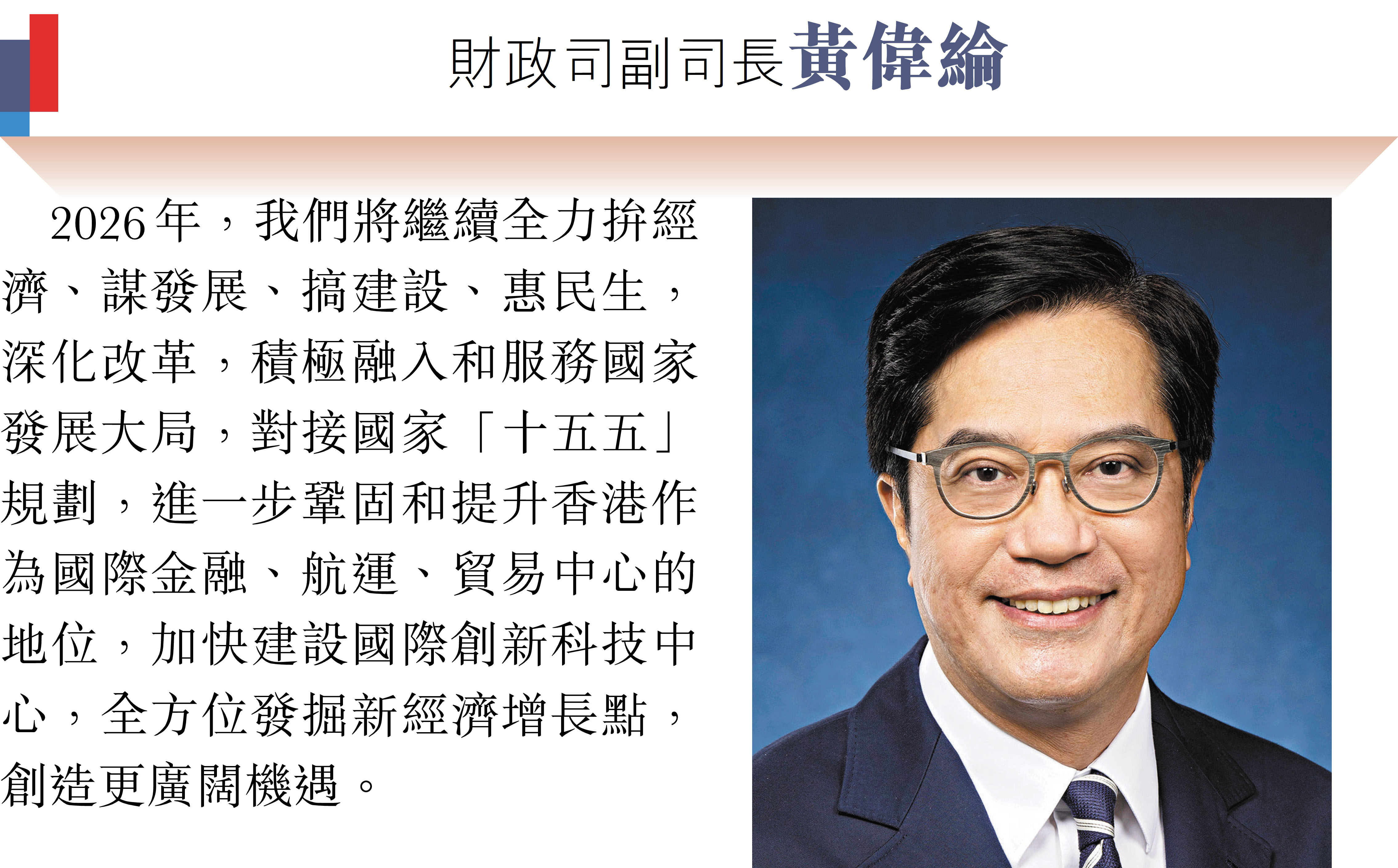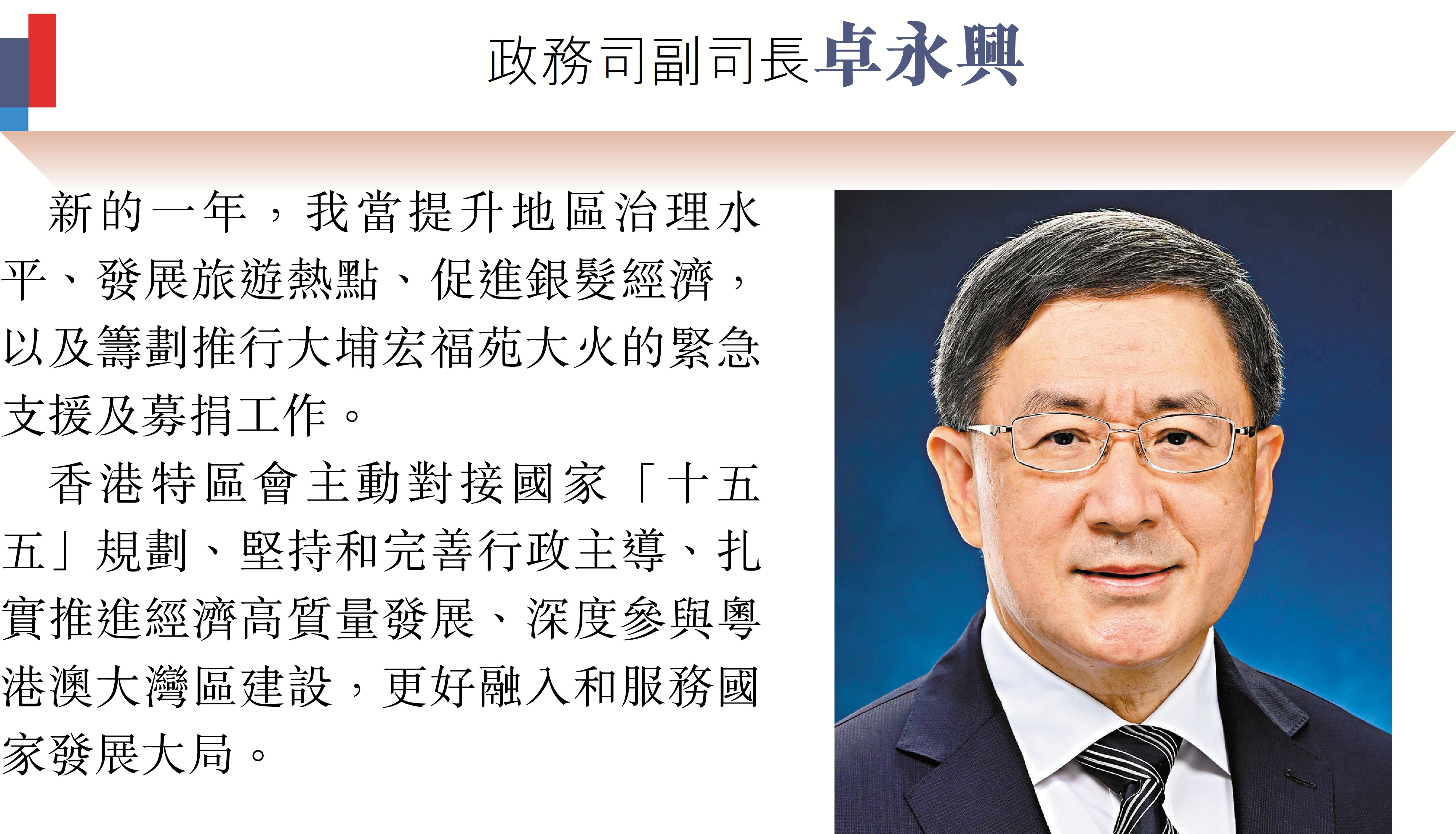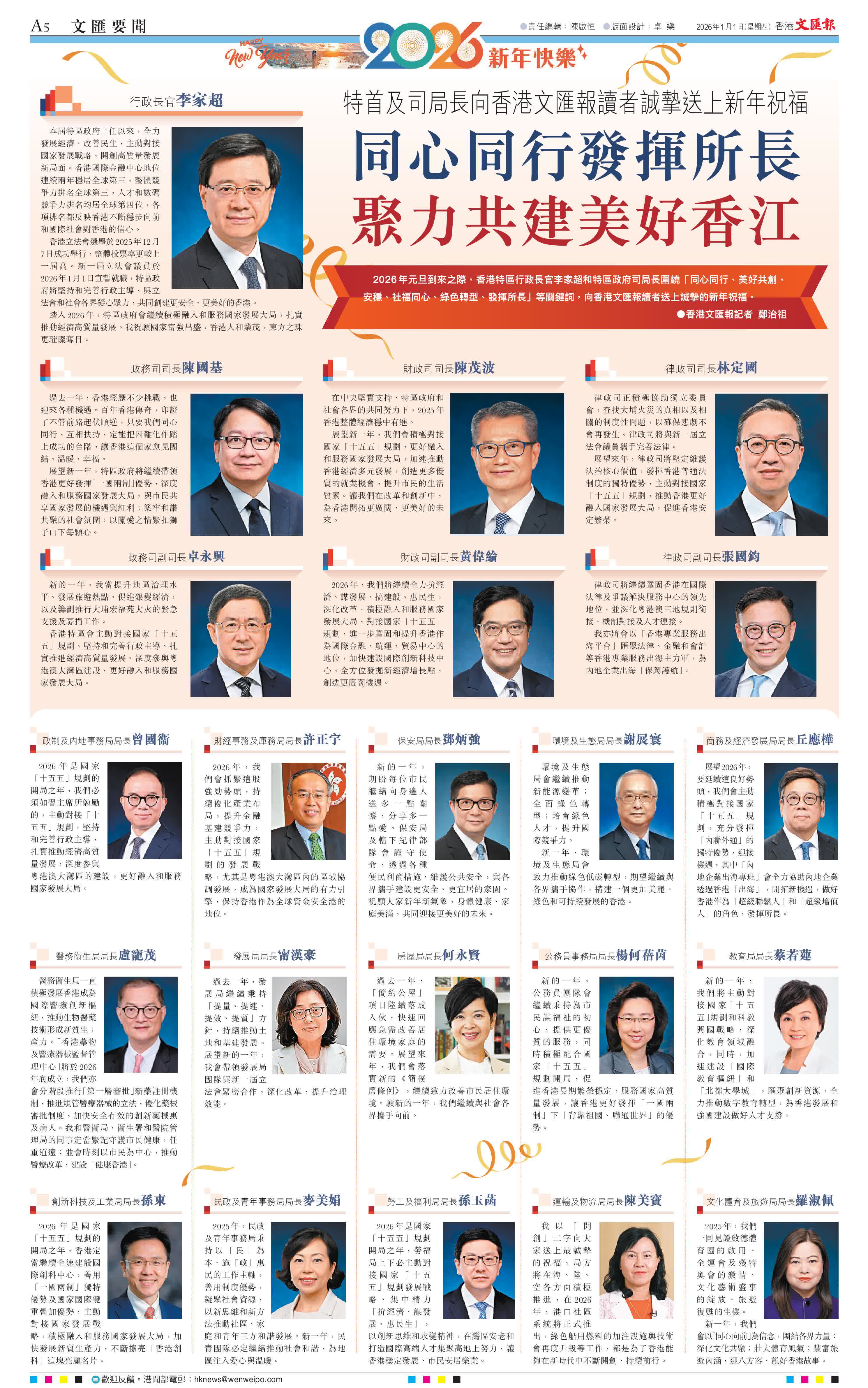 (香港文匯報記者 鄭治祖)2026年元旦到來之際,香港特區行政長官李家超和特區政府司局長圍繞「同心同行、美好共創、安穩、社福同心、綠色轉型、發揮所長」等關鍵詞,向香港文匯報讀者送上誠摯的新年祝福。