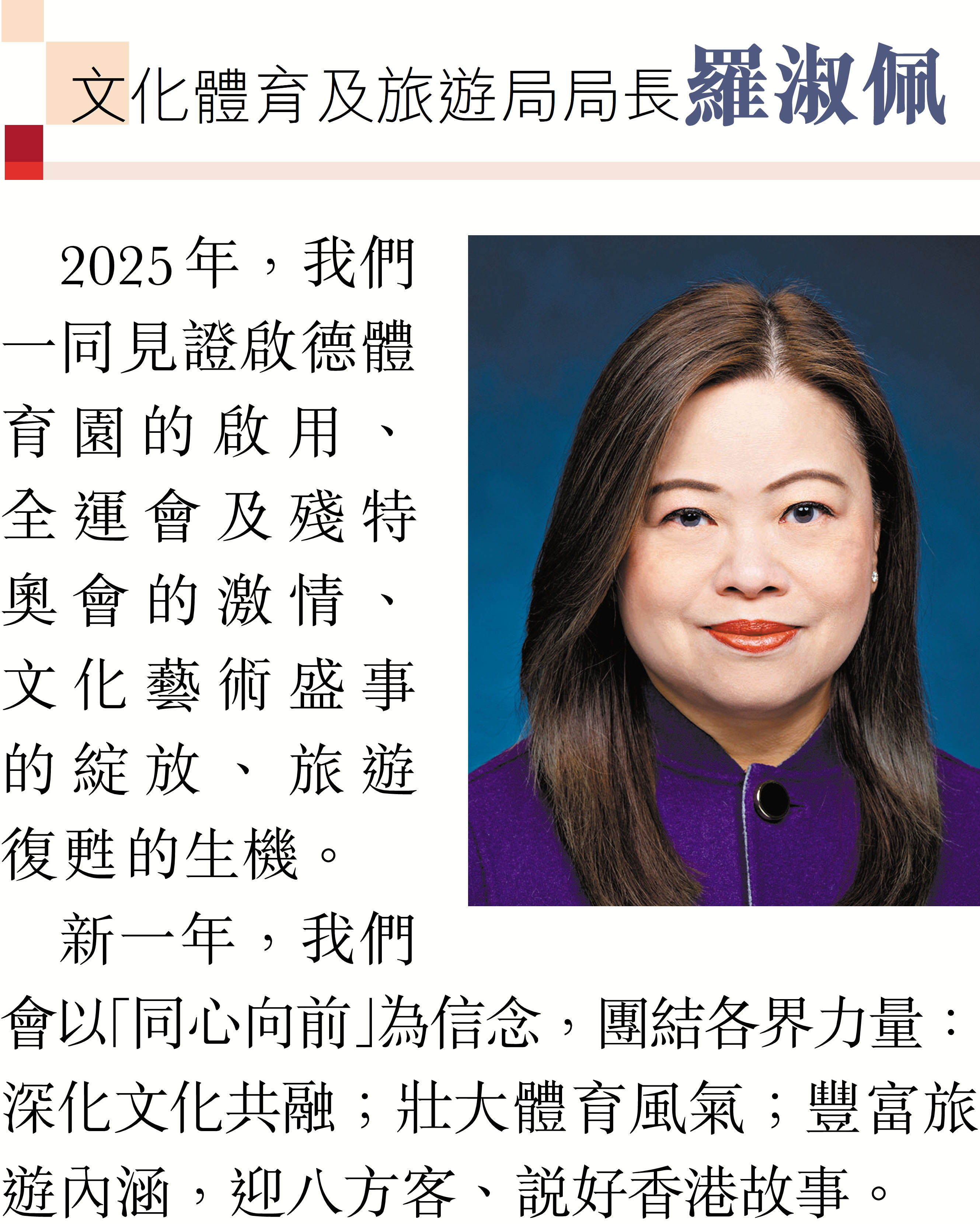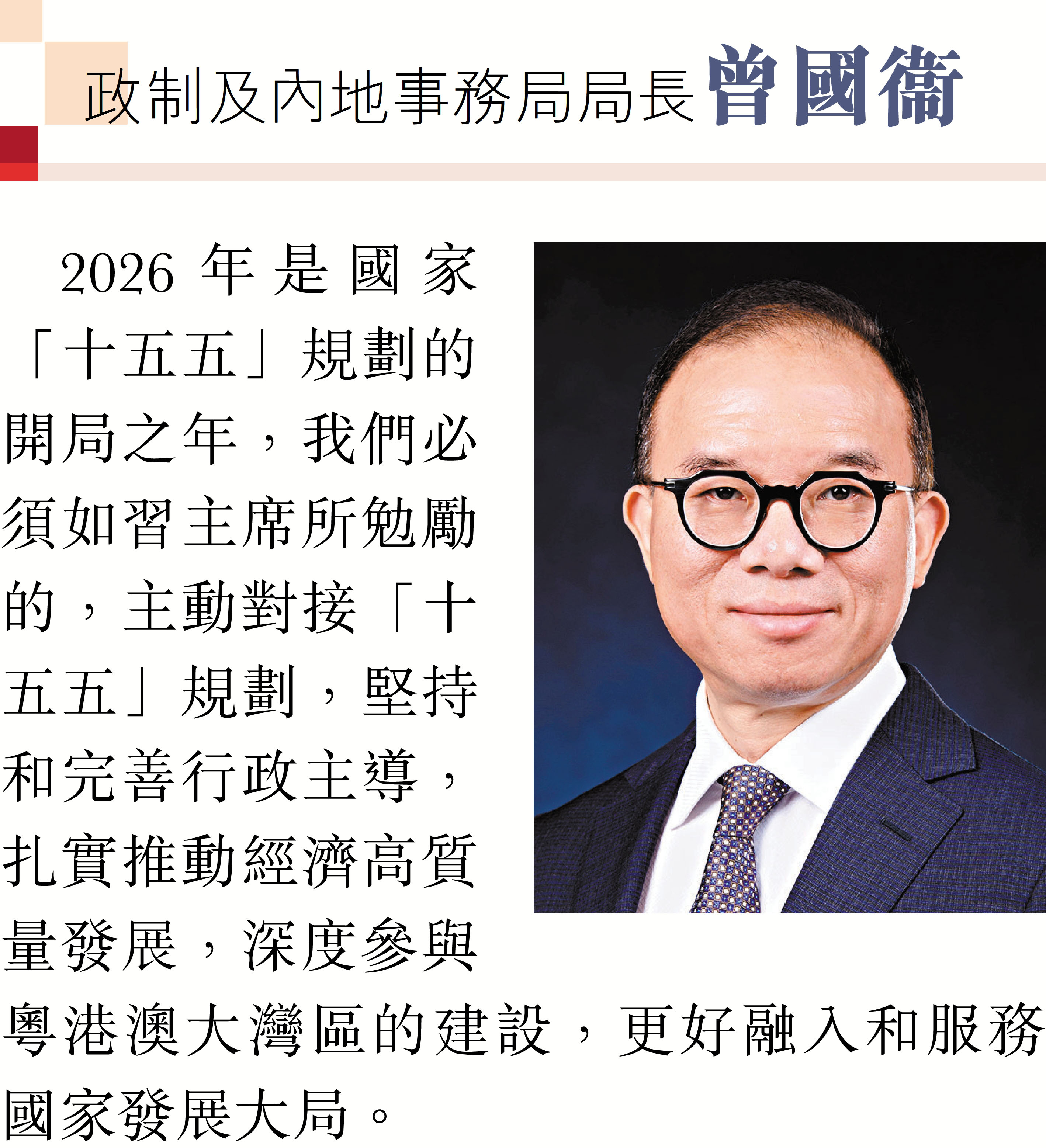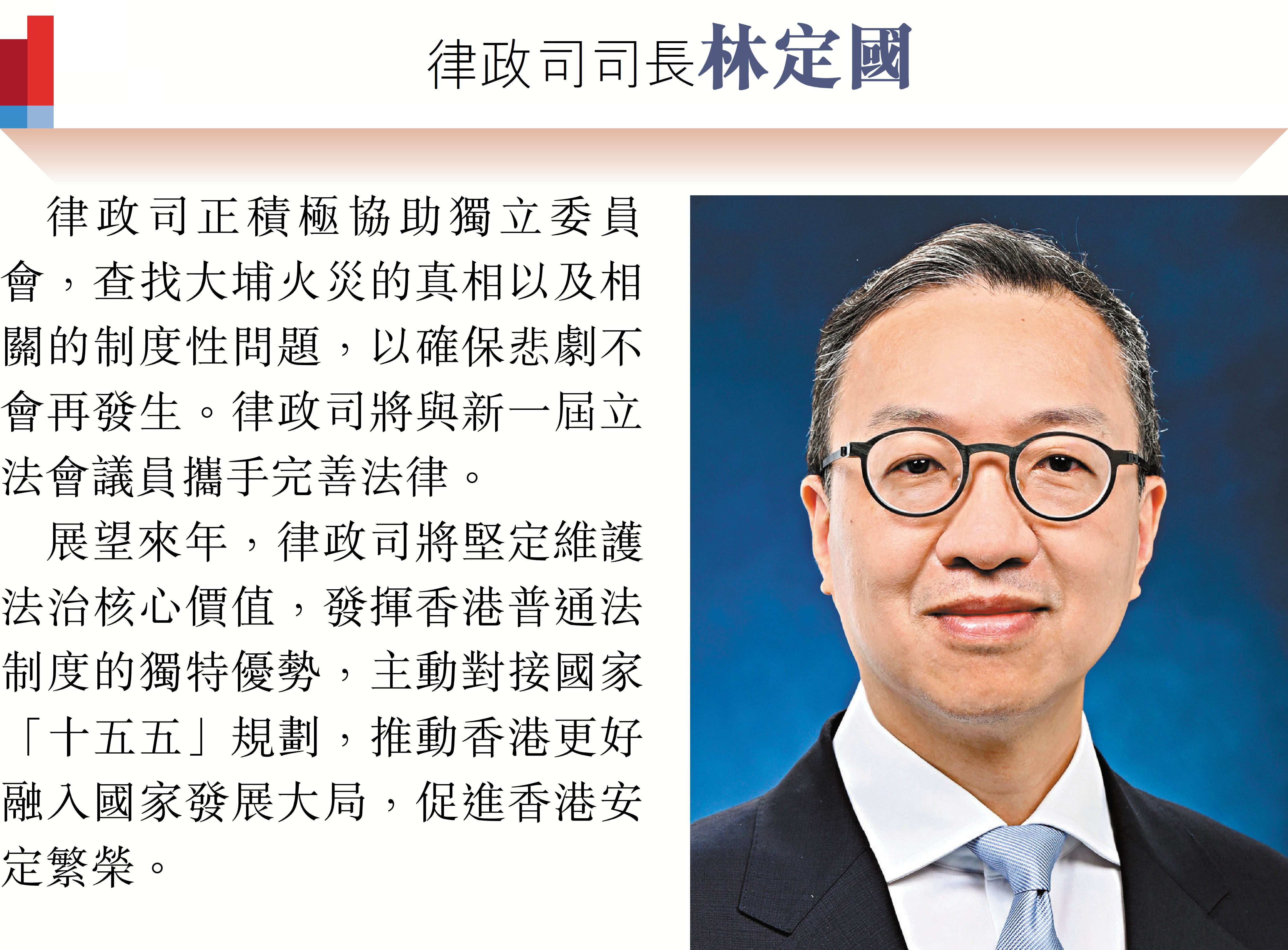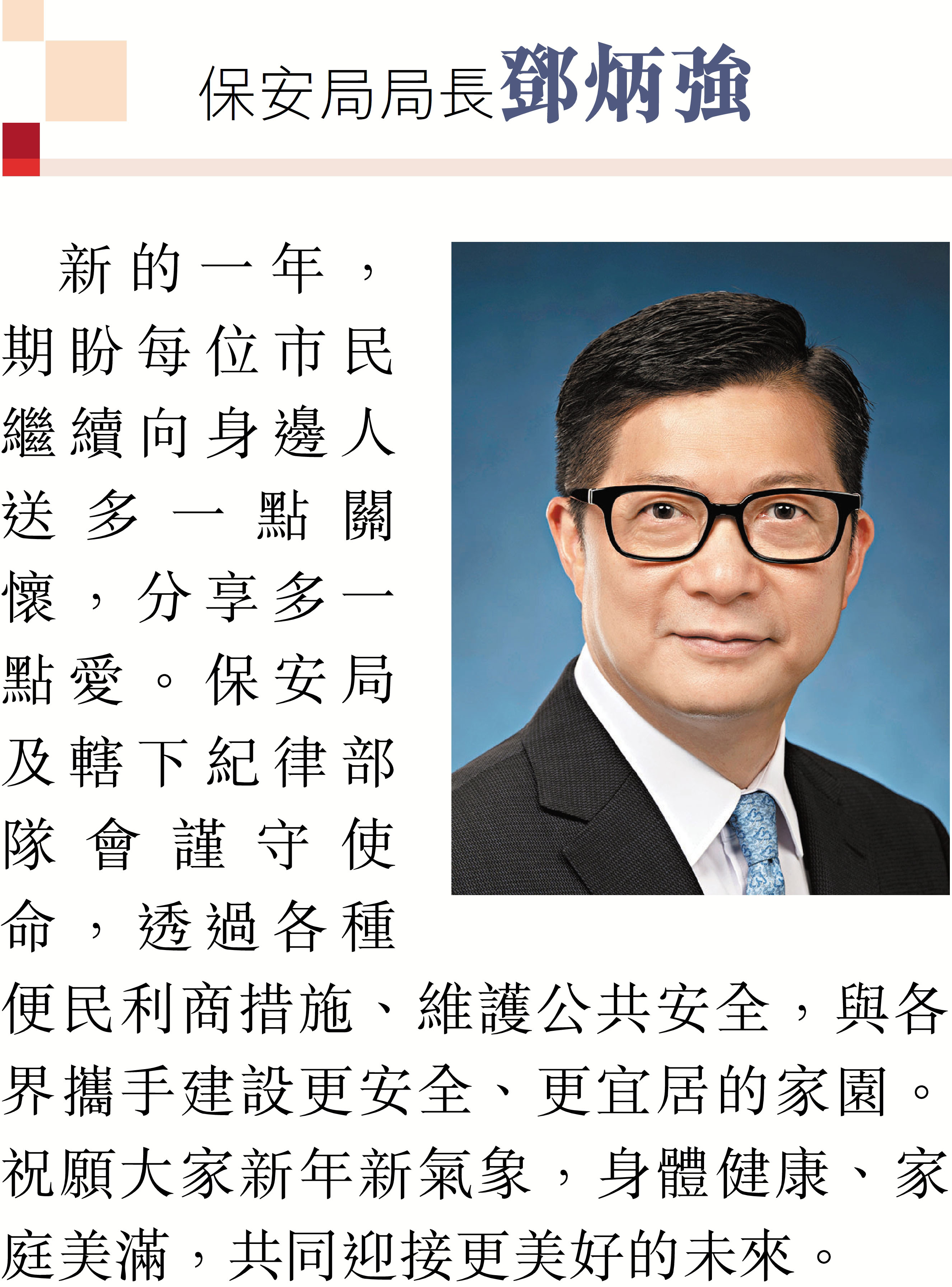 (香港文匯報記者 鄭治祖)2026年元旦到來之際,香港特區行政長官李家超和特區政府司局長圍繞「同心同行、美好共創、安穩、社福同心、綠色轉型、發揮所長」等關鍵詞,向香港文匯報讀者送上誠摯的新年祝福。