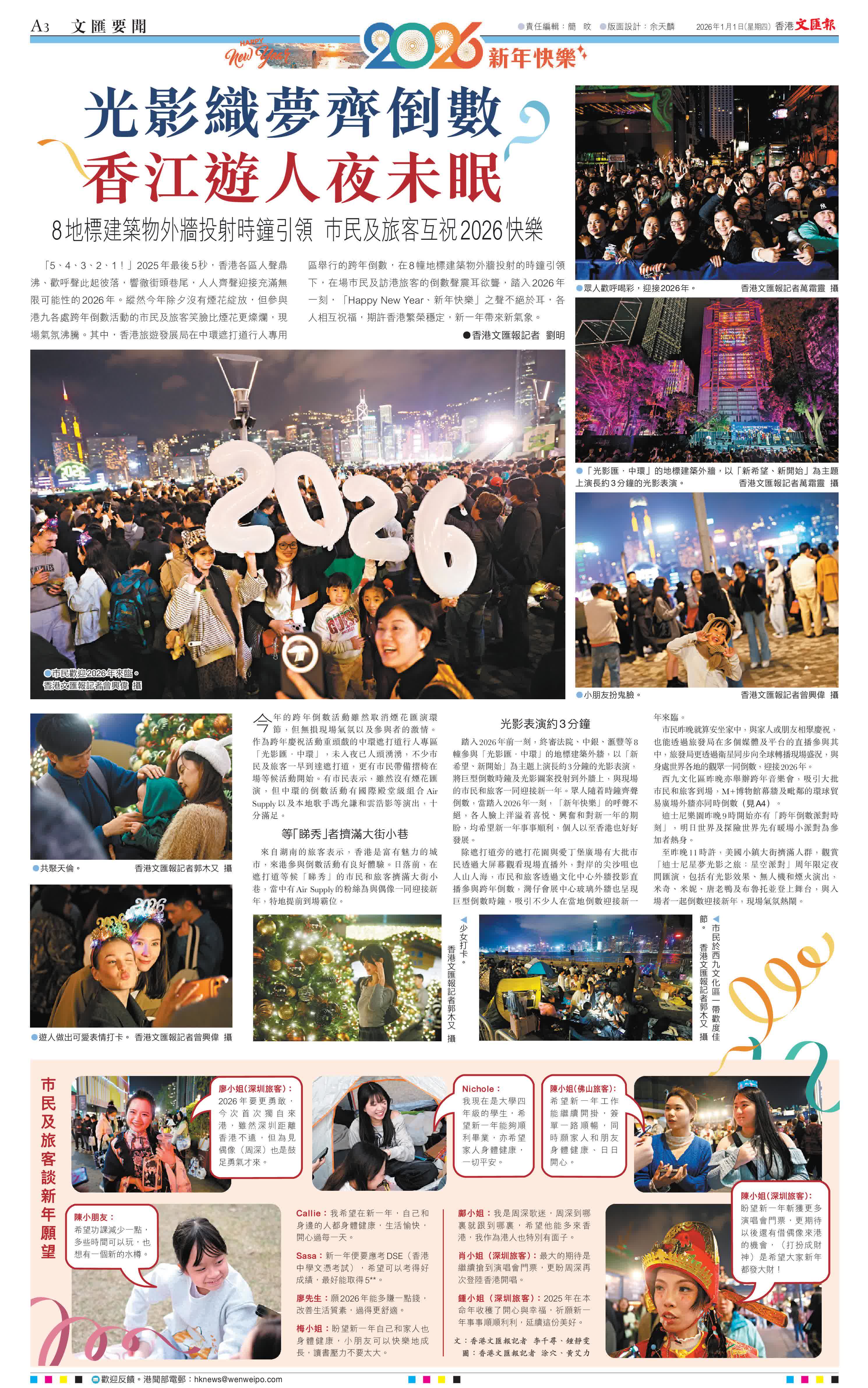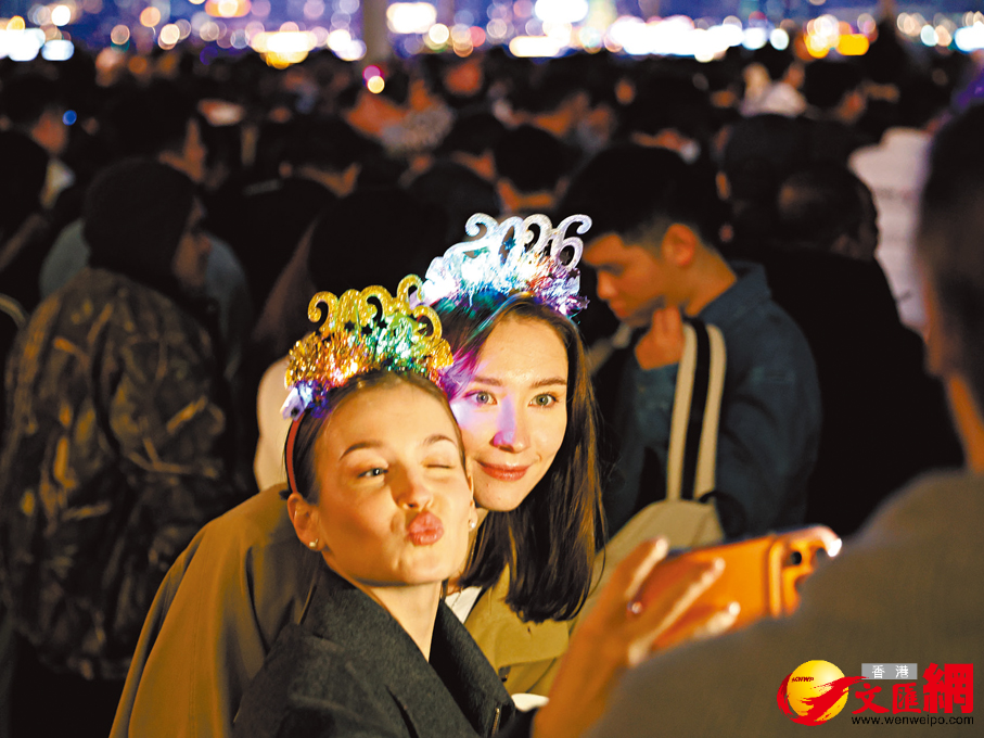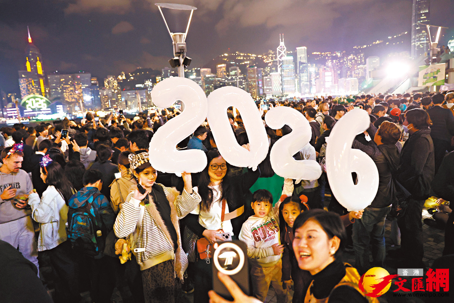 (香港文匯報記者 劉明)「5、4、3、2、1!」2025年最後5秒,香港各區人聲鼎沸、歡呼聲此起彼落,響徹街頭巷尾,人人齊聲迎接充滿無限可能性的2026年。縱然今年除夕沒有煙花綻放,但參與港九各處跨年倒數活動的市民及旅客笑臉比煙花更燦爛,現場氣氛沸騰。其中,香港旅遊發展局在中環遮打道行人專用區舉行的跨年倒數,在8幢地標建築物外牆投射的時鐘引領下,在場巿民及訪港旅客的倒數聲震耳欲聾,踏入2026年一刻,「Happy New Year、新年快樂」之聲不絕於耳,各人相互祝福,期許香港繁榮穩定,新一年帶來新氣象。
