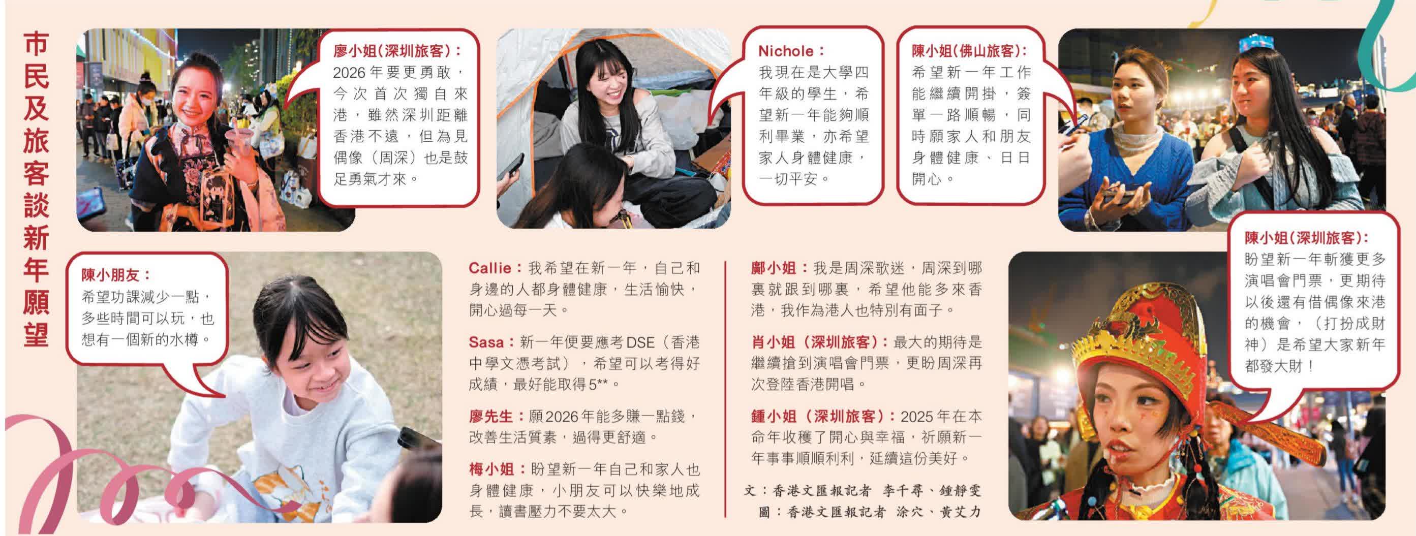 來自湖南的旅客表示,香港是富有魅力的城市,來港參與倒數活動有良好體驗。日落前,在遮打道等候「睇秀」的巿民和旅客擠滿大街小巷,當中有Air Supply的粉絲為與偶像一同迎接新年,特地提前到場霸位。