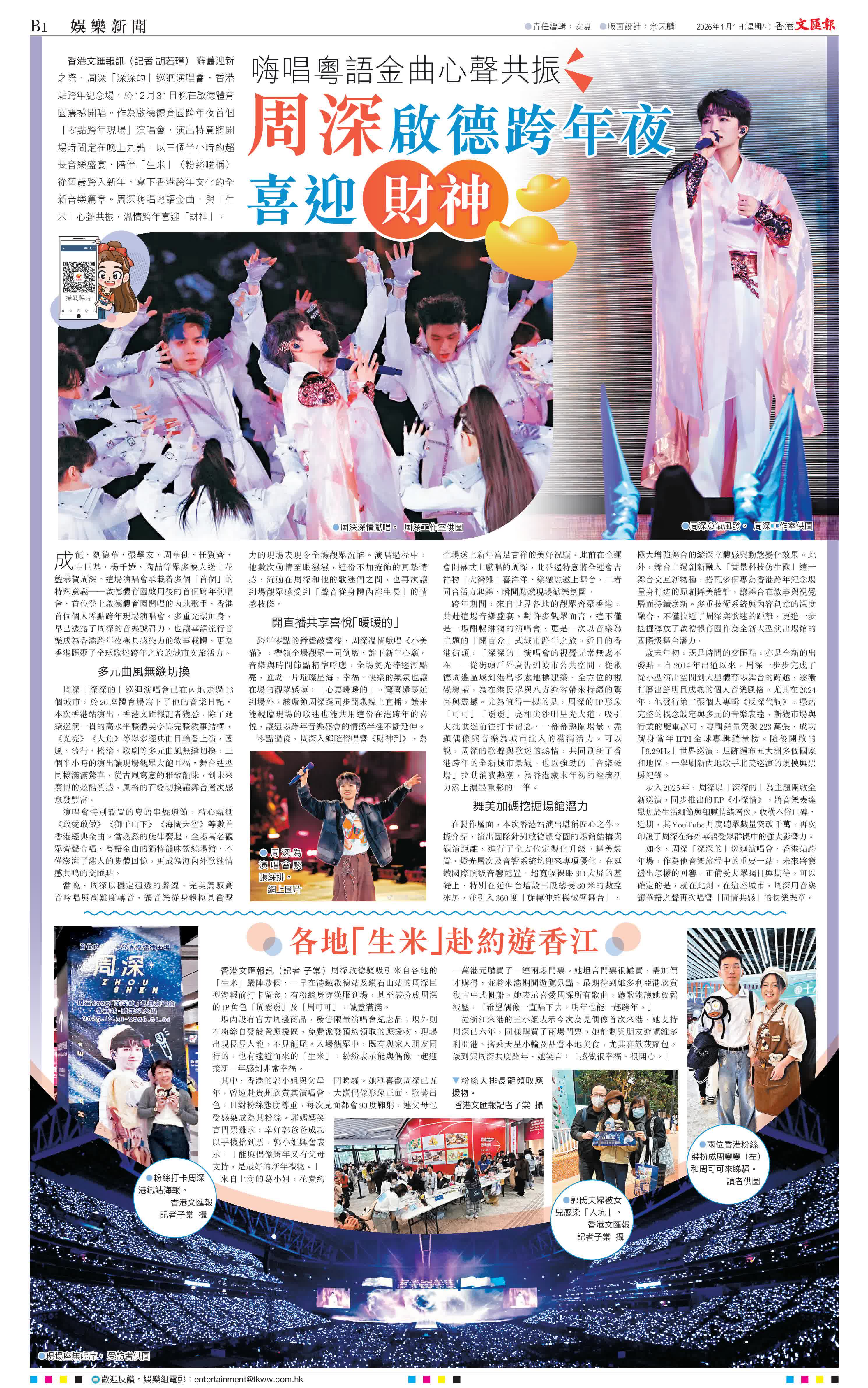香港文匯報訊(記者 胡若璋) 辭舊迎新之際,周深「深深的」巡迴演唱會·香港站跨年紀念場,於12月31日晚在啟德體育園震撼開唱。作為啟德體育園跨年夜首個「零點跨年現場」演唱會,演出特意將開場時間定在晚上九點,以三個半小時的超長音樂盛宴,陪伴「生米」(粉絲暱稱)從舊歲跨入新年,寫下香港跨年文化的全新音樂篇章。周深嗨唱粵語金曲,與「生米」心聲共振,溫情跨年喜迎「財神」。