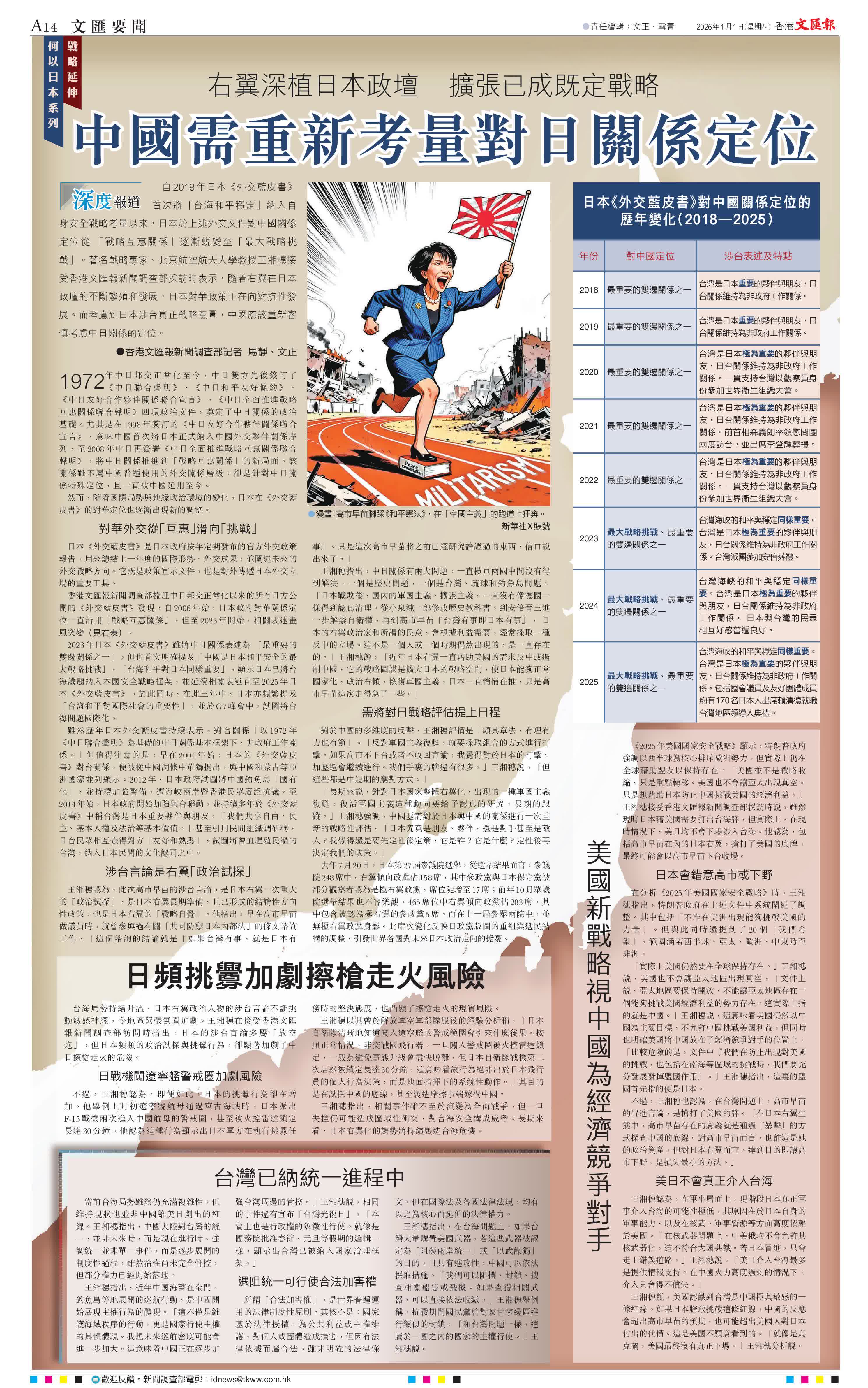 (香港文匯報新聞調查部記者 馬靜、文正)自2019年日本《外交藍皮書》首次將「台海和平穩定」納入自身安全戰略考量以來,日本於上述外交文件對中國關係定位從 「戰略互惠關係」逐漸蛻變至「最大戰略挑戰」。著名戰略專家、北京航空航天大學教授王湘穗接受香港文匯報新聞調查部採訪時表示,隨着右翼在日本政壇的不斷繁殖和發展,日本對華政策正在向對抗性發展。而考慮到日本涉台真正戰略意圖,中國應該重新審慎考慮中日關係的定位。