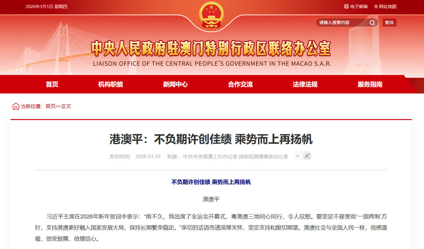 我們相信,新的一年,在中央政府和祖國內地的全力支持下,香港、澳門特區政府必將團結帶領社會各界主動對接「十五五」規劃,充分發揮港澳獨特優勢和重要作用,更好融入和服務國家發展大局,在以中國式現代化全面推進強國建設、民族復興偉業的壯闊征程中實現更好發展、作出更大貢獻!