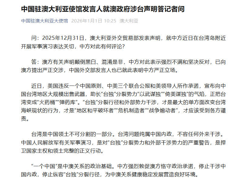 有記者提問:2025年12月31日,澳大利亞外交貿易部發表聲明,就中方近日在台灣島附近開展軍事演習表達關切,中方對此有何評論?
