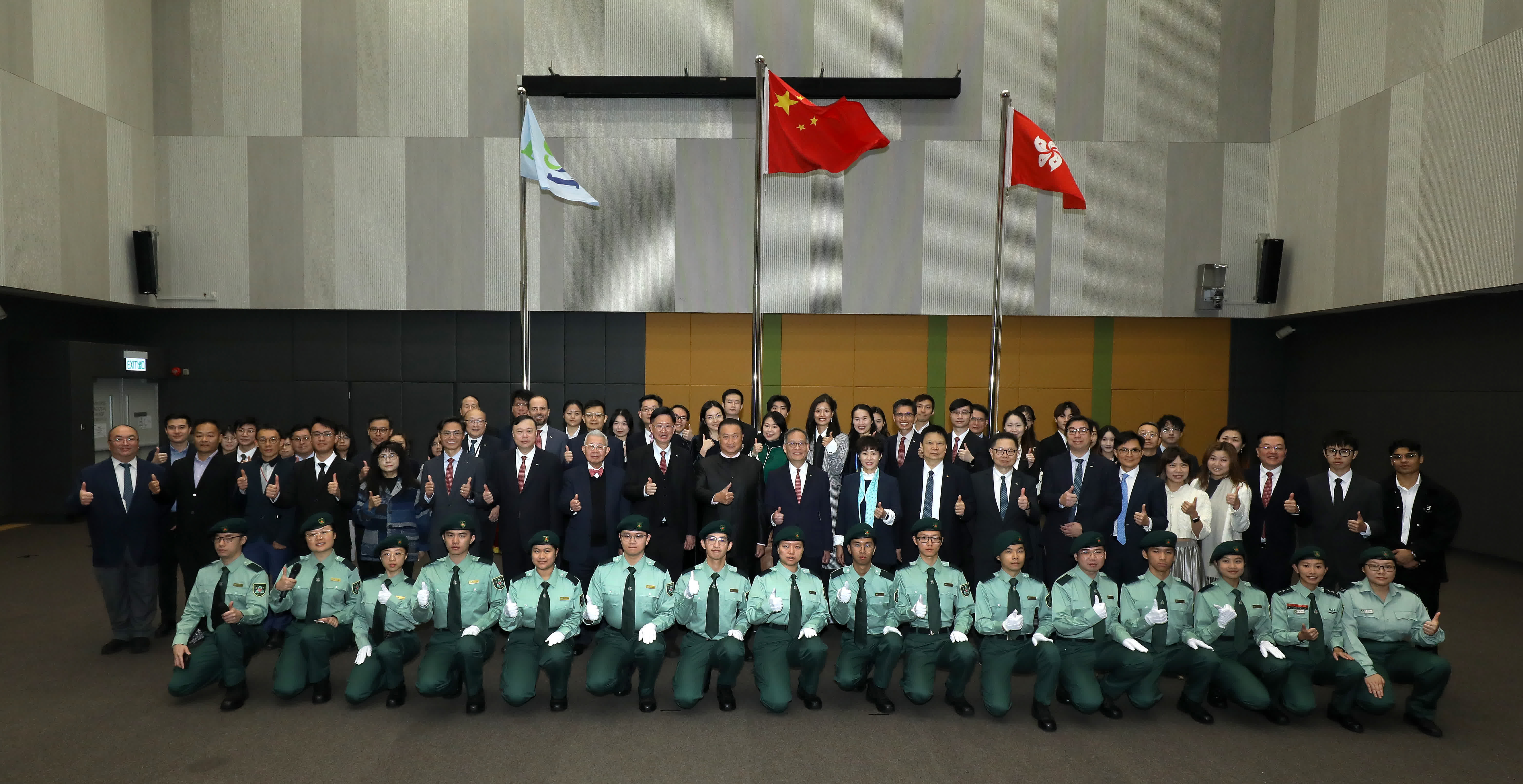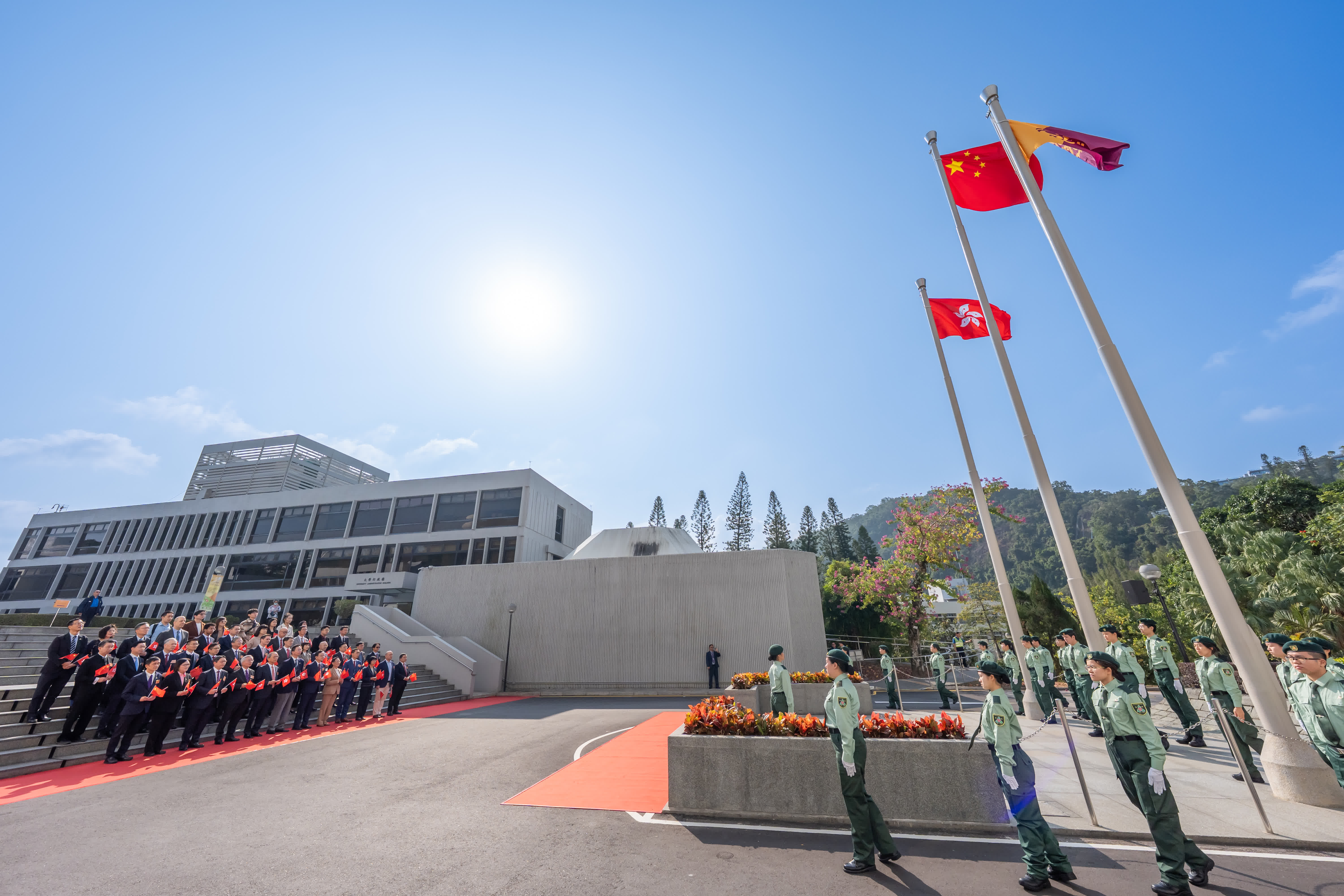 林群聲勉勵學生積極提升專業知識及全方位技能,迎接瞬息萬變的世界。他亦對學生國旗護衛隊成立感到欣喜,認為可提升學生對國家歸屬感及鞏固國民身份認同。都大學生國旗護衛隊由14名都大全日制本科課程學生組成,並已接受香港青少年軍總會專業升旗訓練。就讀教育榮譽學士及語言研究榮譽學士一年級的陳同學表示,訓練可加強隊員國民意識,參與護衛隊是寶貴經驗;持續旅遊及款待管理榮譽工商管理學士一年級生楊同學則指訓練緊湊,培養合作與團結精神,致力確保升旗儀式莊嚴進行。都大表示,為推廣國民教育,校園每天升掛國旗,並於每周一早上及元旦、特區成立紀念日、國慶等重要日子舉行升國旗儀式。