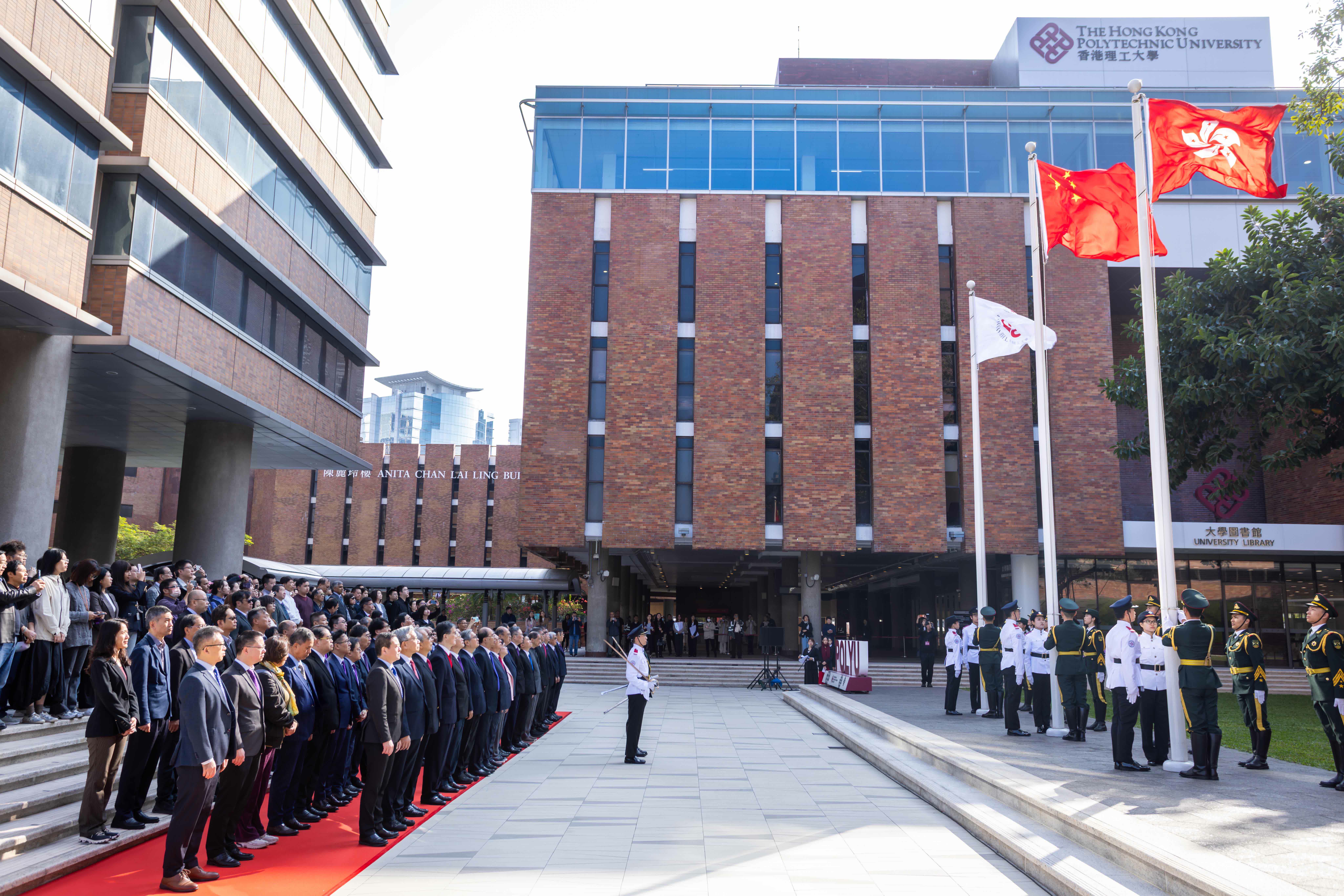 香港理工大學今早於校園舉行升旗儀式迎接新一年。理大校董會主席林大輝、校長滕錦光等聯同校董會成員、顧問委員會成員、管理層、傑出校友、理大基金會成員、嘉賓及近400位師生出席。儀式由理大學生升旗隊,並聯同專程來港的貴州大學國旗護衛隊負責。滕錦光指,隨着理大人工智能高等研究院去年正式成立,將加大力度推進人工智能研發,以創新科技催生新質生產力,為國家科技自立自強作出貢獻。