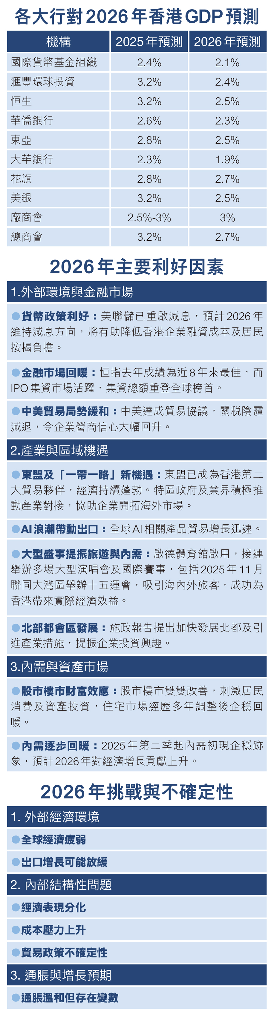 2025年香港經濟展現出不錯的增長動力,主要受惠出口理想,訪港旅遊業和本地服務業擴張,以及股市和樓市改善刺激私人消費等。鑑於第三季GDP增長3.8%的強勁勢頭遠勝預期,特區政府最新上調2025年全年實質GDP增長預測至3.2%。展望2026年,不少商會都預期香港經濟能夠繼續穩步增長,主要動力包括:股市和樓市等資產市場的表現有望繼續改善,美聯儲2026年仍將維持減息的大方向,東盟及「一帶一路」沿線經濟體將為港商帶來更大商機,以及一連串的大型盛事活動吸引內地及海外旅客來港,本地內需市道進一步回暖向好等多項利好因素。