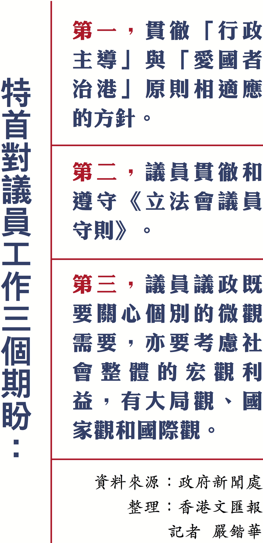 (香港文匯報記者 嚴鍇華)香港特區第八屆立法會任期昨日開始,90位候任立法會議員昨日上午11時在立法會綜合大樓會議廳舉行宣誓儀式,由香港特區行政長官李家超監誓,並確定全體90名候任立法會議員的宣誓有效。李家超致辭時表示,對議員的工作寄予厚望,並提出3個期盼,包括貫徹「行政主導」與「愛國者治港」原則相適應的方針;貫徹和遵守《立法會議員守則》;議政既要關心個別的微觀需要,亦要考慮社會整體的宏觀利益,有大局觀、國家觀和國際觀。他強調,「愛國者治港」不是口號,必須實實在在地落實在實踐中。議會運作要堅持理性、專業和建設性,實現高效高質量議政,這些是對行政立法雙方既互相制衡,又互相配合的重要考驗。