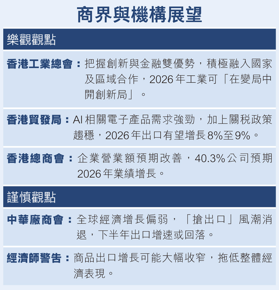 (香港文匯報記者 莊程敏)2025年香港經濟展現出不錯的增長動力,主要受惠出口理想,訪港旅遊業和本地服務業擴張,以及股市和樓市改善刺激私人消費等。鑑於第三季GDP增長3.8%的強勁勢頭遠勝預期,特區政府最新上調2025年全年實質GDP增長預測至3.2%。展望2026年,不少商會都預期香港經濟能夠繼續穩步增長,主要動力包括:股市和樓市等資產市場的表現有望繼續改善,美聯儲2026年仍將維持減息的大方向,東盟及「一帶一路」沿線經濟體將為港商帶來更大商機,以及一連串的大型盛事活動吸引內地及海外旅客來港,本地內需市道進一步回暖向好等多項利好因素。