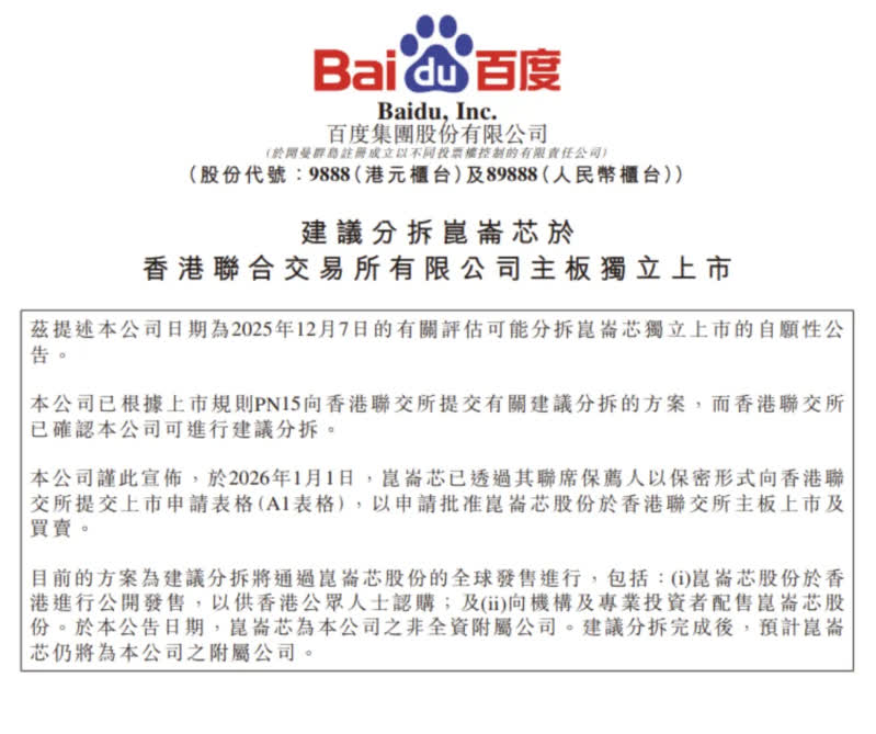1月2日,百度發布公告稱,1月1日,崑崙芯已透過其聯席保薦人以保密形式向香港聯交所提交上市申請表格(A1表格),以申請批准崑崙芯股份於香港聯交所主板上市及買賣。目前的方案為建議分拆將通過崑崙芯股份的全球發售進行,包括:(i)崑崙芯股份於香港進行公開發售,以供香港公眾人士認購;及(ii)向機構及專業投資者配售崑崙芯股份。於本公告日期,崑崙芯為本公司之非全資附屬公司。建議分拆完成後,預計崑崙芯仍將為本公司之附屬公司。