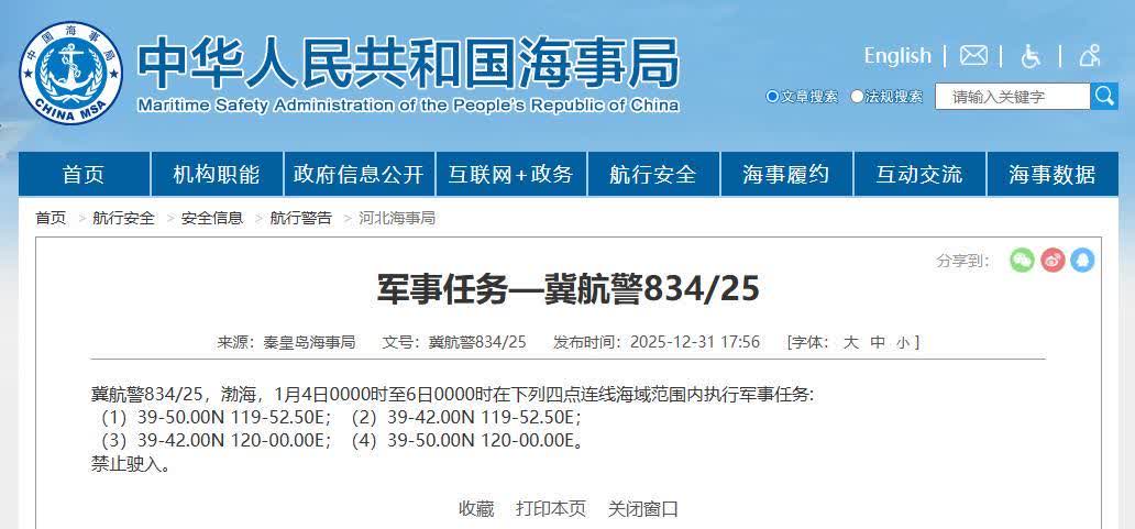 據中國海事局網站消息,秦皇島海事局發布航行警告,1月4日0時至6日0時,渤海部分海域執行軍事任務,禁止駛入。