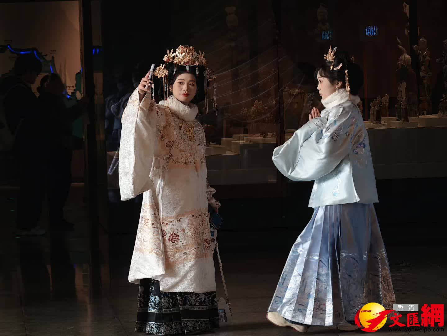 元旦首日的洛陽隋唐大運河博物館,成為國風愛好者的聚集地。記者在現場看到,不少年輕人身着唐制襦裙、漢式襖裙等傳統服飾漫步場館,衣袂翩躚間與古朴的場館氛圍完美融合。旋轉樓梯的光影掠過裙擺,運河浮雕前駐足凝視,年輕人們或駐足拍照定格瞬間,或細細端詳文物背後的漕運故事,每一步都彷彿踏入千年歷史畫卷。