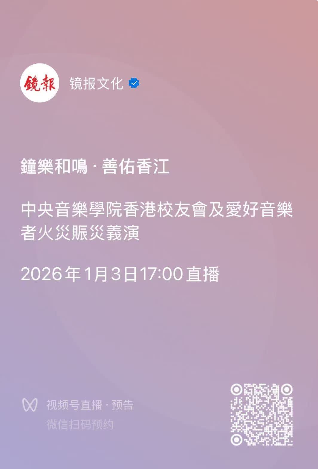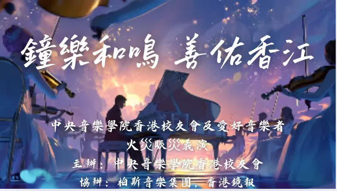 近日香港發生的火災事故牽動人心,社會各界紛紛伸出援手,共渡時艱。為向受災同胞傳遞關懷與力量,發揚同舟共濟的獅子山精神,中央音樂學院香港校友會及香港愛好音樂者定於2026年1月3日(星期六)下午5:00-6:30在銅鑼灣時代廣場9樓「柏斯音樂演奏廳」舉辦「鍾樂和鳴 善佑香江」義演音樂會。