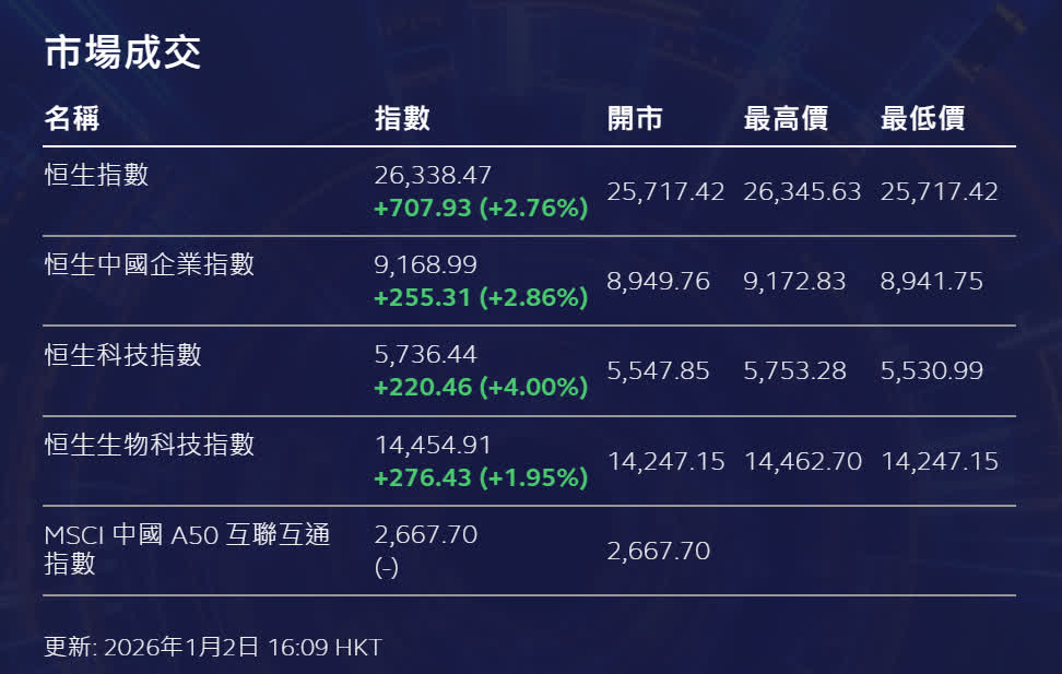 香港文匯報訊 港股於2026年首個交易日高開高收。恒生指數收報26,338點,全日升707點或2.76%。國企指數升2.86%。恒生科技指數升4,00%,表現相對出色。在A股停市、港股通暫停交易下,大市成交金額仍達1,409億元,投資活動暢旺。
