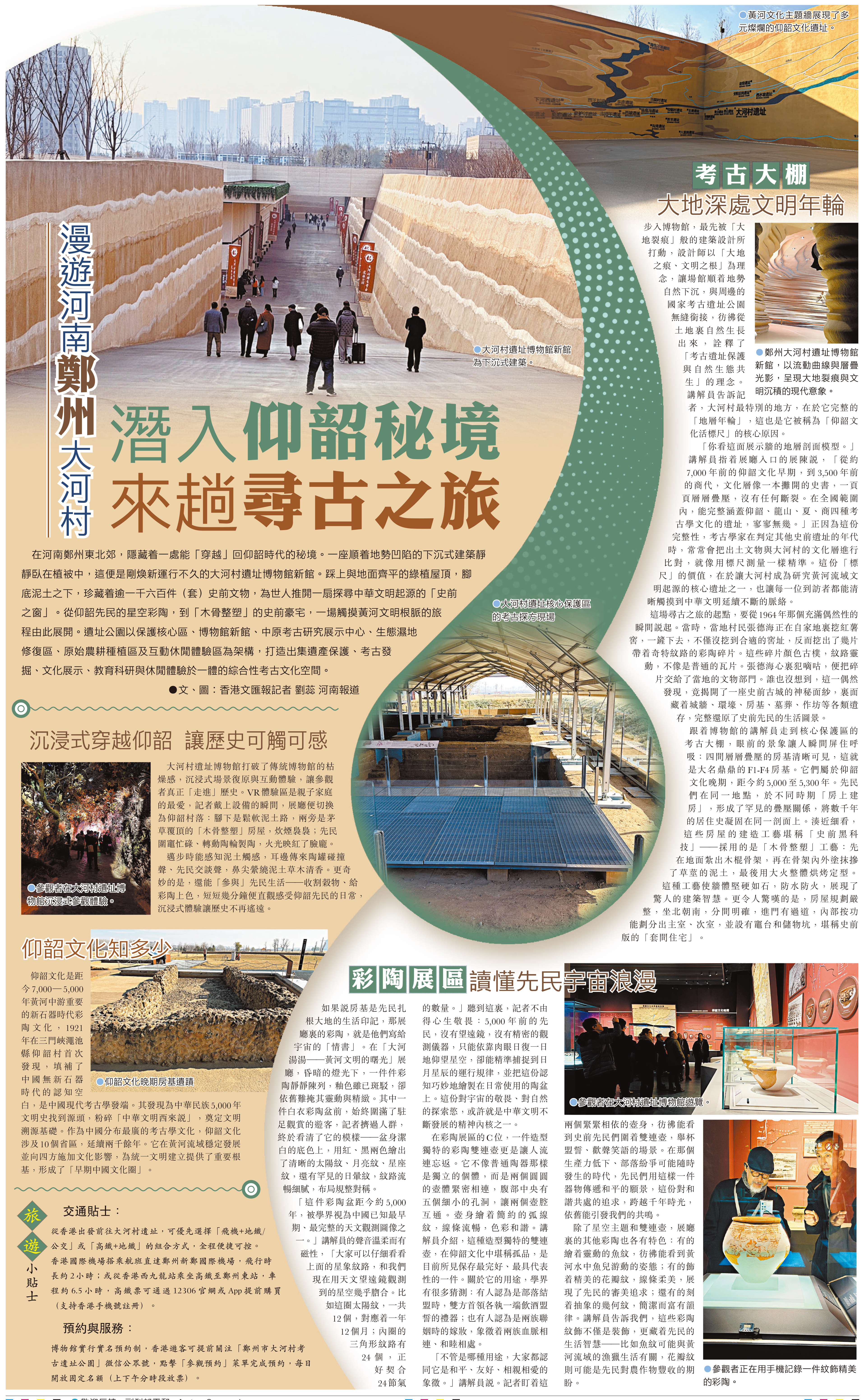 在河南鄭州東北郊,隱藏着一處能「穿越」回仰韶時代的秘境。一座順着地勢凹陷的下沉式建築靜靜臥在植被中,這便是剛煥新運行不久的大河村遺址博物館新館。踩上與地面齊平的綠植屋頂,腳底泥土之下,珍藏着逾一千六百件(套)史前文物,為世人推開一扇探尋中華文明起源的「史前之窗」。從仰韶先民的星空彩陶,到「木骨整塑」的史前豪宅,一場觸摸黃河文明根脈的旅程由此展開。遺址公園以保護核心區、博物館新館、中原考古研究展示中心、生態濕地修復區、原始農耕種植區及互動休閒體驗區為架構,打造出集遺產保護、考古發掘、文化展示、教育科研與休閒體驗於一體的綜合性考古文化空間。