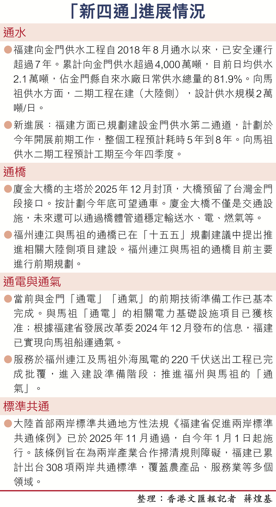 從「小三通」到「新四通」,兩岸民眾期待交流交往更加便捷,為兩岸融合發展注入新動能。近年來,閩台基礎設施「應通盡通」取得積極進展,逐步建立起兩岸最便捷海空立體通道。一批新的港口碼頭、通關設施投入使用,沿海港區綜合建設成果顯著,與對台客運碼頭配套的公路、鐵路、機場等設施體系不斷完善,廈金大橋廈門段等基礎設施建設如火如荼,兩岸「以通促融」步伐不斷加快。