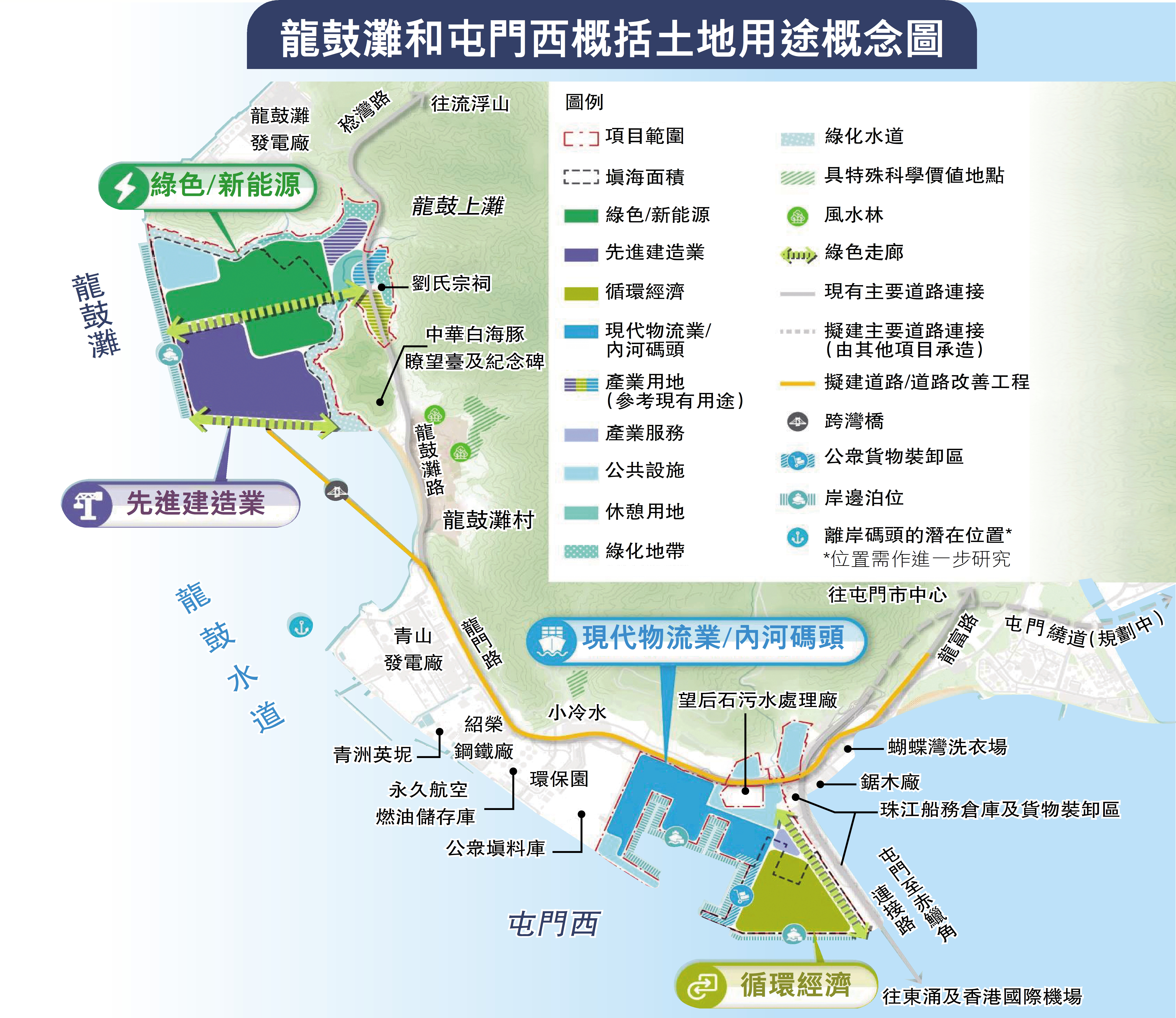 為善用龍鼓灘及屯門西鄰近北部都會區、香港國際機場及珠江三角洲地區的策略位置以助力產業發展,特區政府發展局建議透過近岸填海造地及改造約111公頃現有土地,將龍鼓灘及屯門西重新規劃成「智綠產業港」,提供總面積約301公頃的新發展土地,發展綠色新能源、先進建造業、循環經濟,以及現代物流業四大核心產業,以促進創新與探索新科技、提高生產力及增強區域競爭力,初步預計可創造約3.5萬個就業機會。擬議工程暫定於2028年展開,目標2029年產出首批用地。