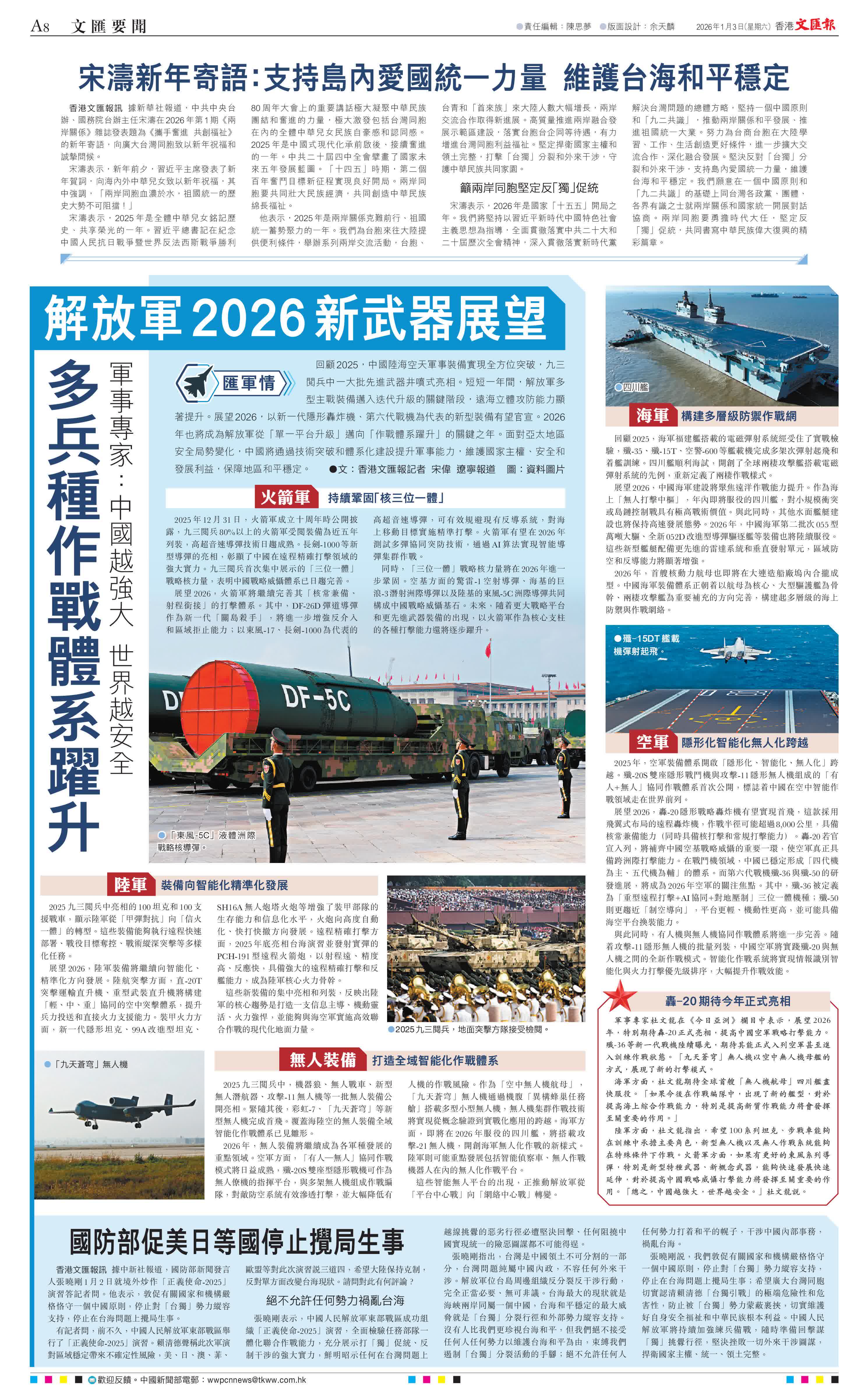 (香港文匯報記者 宋偉 遼寧報道)回顧2025,中國陸海空天軍事裝備實現全方位突破,九三閱兵中一大批先進武器井噴式亮相。短短一年間,解放軍多型主戰裝備邁入迭代升級的關鍵階段,遠海立體攻防能力顯著提升。展望2026,以新一代隱形轟炸機、第六代戰機為代表的新型裝備有望官宣。2026年也將成為解放軍從「單一平台升級」邁向「作戰體系躍升」的關鍵之年。面對亞太地區安全局勢變化,中國將通過技術突破和體系化建設提升軍事能力,維護國家主權、安全和發展利益,保障地區和平穩定。