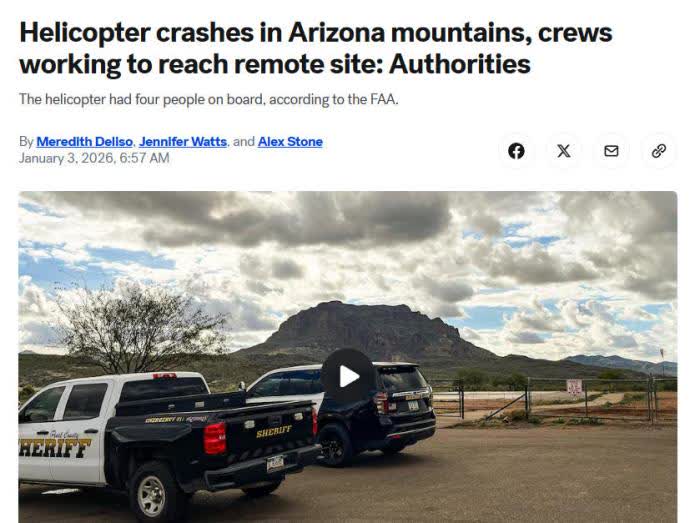 據中新網援引美媒報道,當地時間1月2日,美國一架私人直升機在鳳凰城附近的山區墜毀,救援正在進行中。