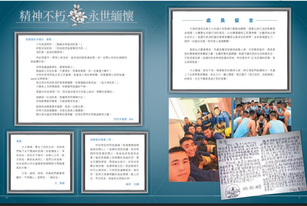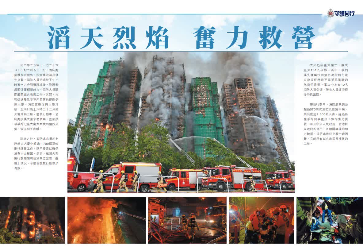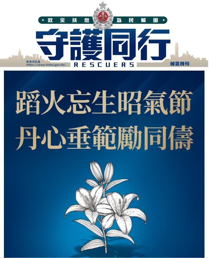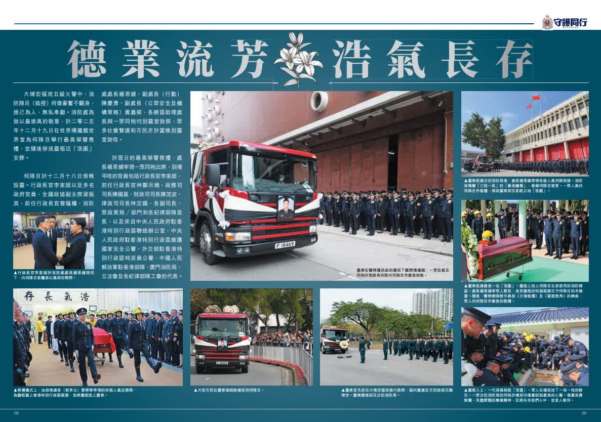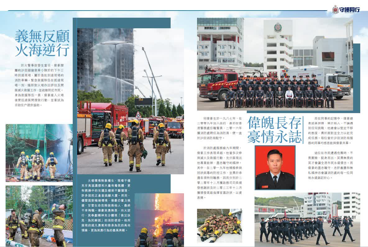 香港文匯報訊(記者 蕭景源)大埔宏福苑大火造成重大傷亡,罹難者中包括滅火救援時不幸英勇殉職的消防員何偉豪,行動中亦有12名消防員受傷,所有傷員治理後均已出院。消防處刊物《守護同行》為了悼念何偉豪而製作特刊,記錄了包括何偉豪在內的消防員奮勇救援的工作,同袍、家人、未婚妻及市民對何偉豪的深情緬懷,其未婚妻 Kiki在給偉豪的信中寫到,十年前我問你:「點解你想做消防員?」你堅定地答我:「因為我想直接幫到市民。」Kiki表示,能夠成為偉豪的未婚妻「是我一生的光榮。」她感謝每一位消防員、救護員的勇敢同專業,令絕望變成希望。