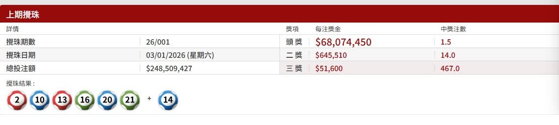 香港文匯報訊 六合彩新年金多寶攪出號碼:2、10、13、16、20、21,特別號碼:14