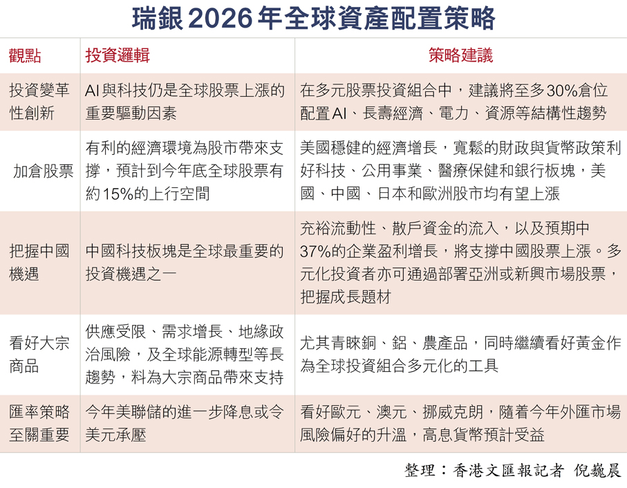 投資策略方面,瑞銀財富管理全球首席投資總監Mark Haefele預計,AI與科技仍是今年全球股市上漲的重要驅動力,建議聚焦資本流入和轉型所涉及的行業或主題,繼續關注「變革性創新」行業,並在多元資產組合中,將至多30%的倉位配置於AI、長壽經濟、電力、資源等結構性趨勢。具體到美股,美國相對穩健的經濟增長,寬鬆的財政和貨幣政策,將直接利好科技、公用事業、醫療保健和銀行等板塊。
