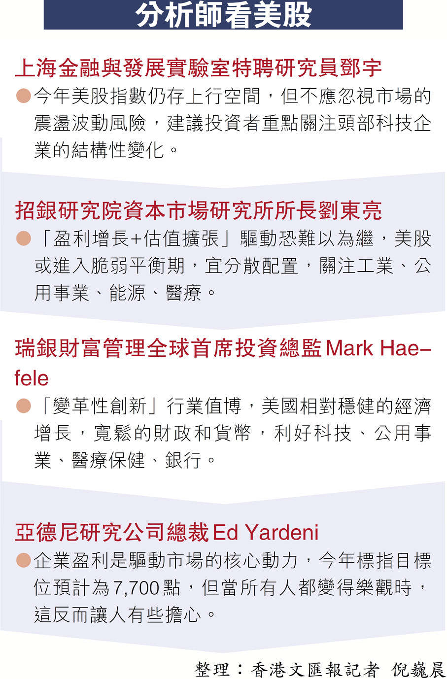 「投資者不應博弈估值擴張,而應賺取盈利增長的收益。」劉東亮建議,維持對美股的標配,在估值回落時可增加配置。具體看,今年美股年化回報或回落至個位數水平,與盈利增速相匹配,後市若現「10%至20%」的回調,市場估值將回歸合理,屆時不妨考慮加大配置力度。布局方面,宜適度分散配置,美股科技股之外,還可關注工業、公用事業、能源、醫療等板塊。