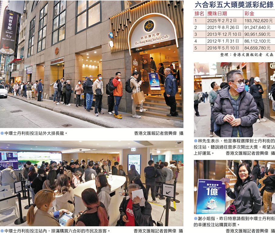 由於有巨額獎金,不少市民昨日都湧到各場外投注站購買六合彩彩票。位於中環士丹利街的馬會投注站,因共錄得47次中六合彩頭獎紀錄,一直高踞本港十大幸運投注站榜首位置,故吸引大批市民及旅客到場投注。香港文匯報記者昨日下午在該投注站了解,發現投注站排隊購買彩票的人龍「打蛇餅」,排隊市民排到投注站外,更延伸到近德己立街,鏡頭甚至無法完全捕捉到壯觀的長龍景象。