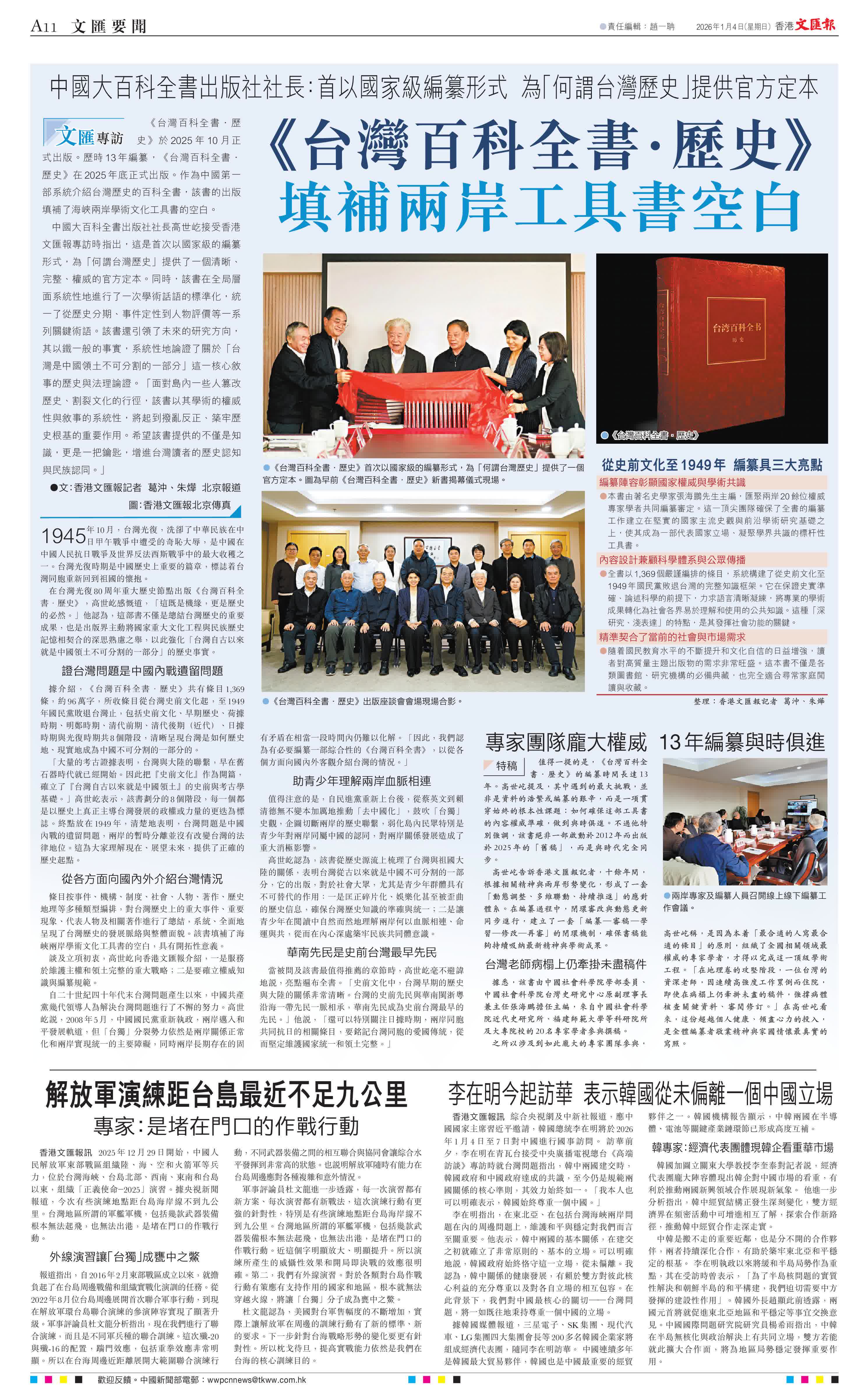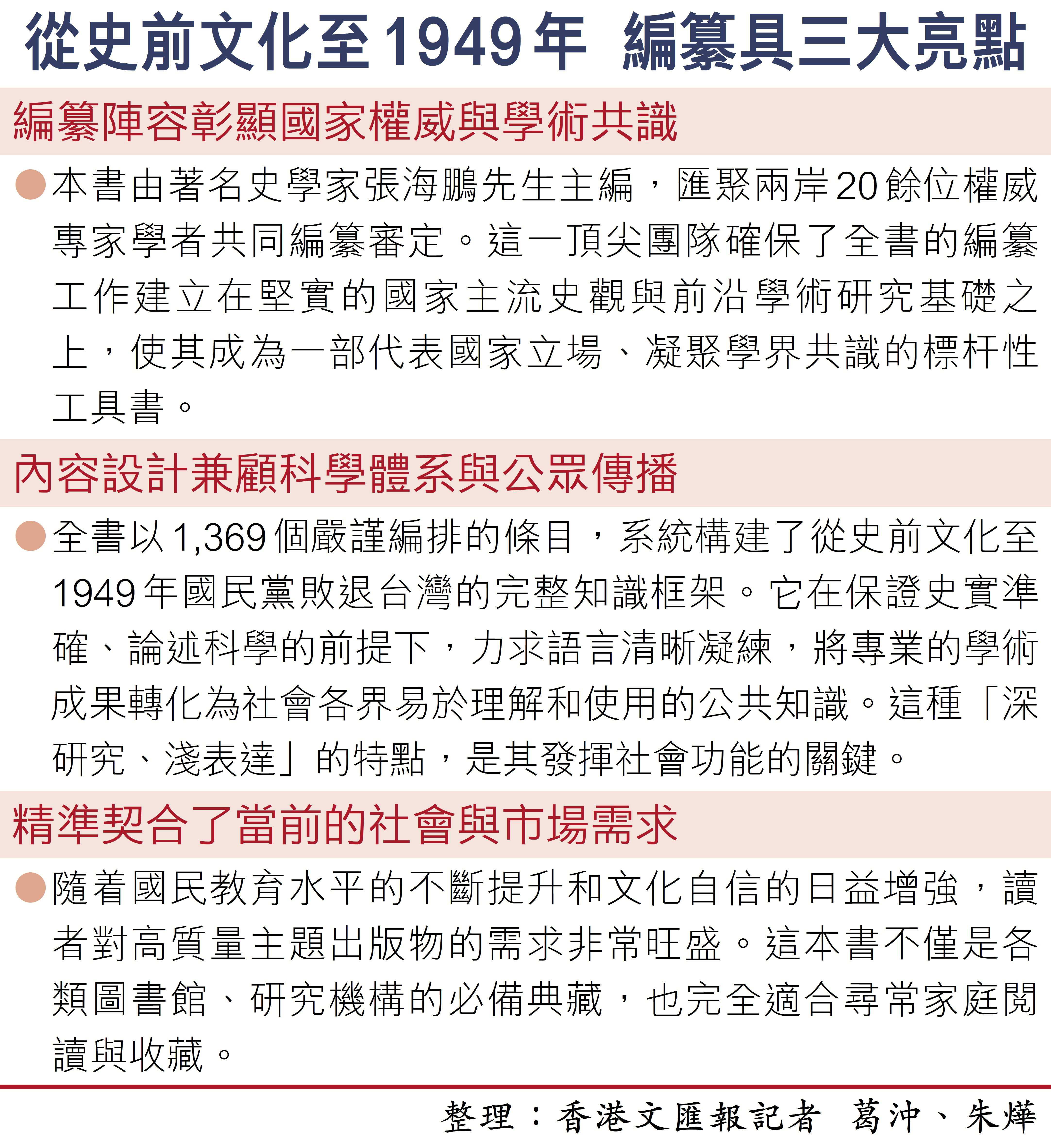 (香港文匯報記者葛沖、朱燁 北京報道)《台灣百科全書·歷史》於2025年10月正式出版。歷時13年編纂,《台灣百科全書·歷史》在2025年底正式出版。作為中國第一部系統介紹台灣歷史的百科全書,該書的出版填補了海峽兩岸學術文化工具書的空白。
