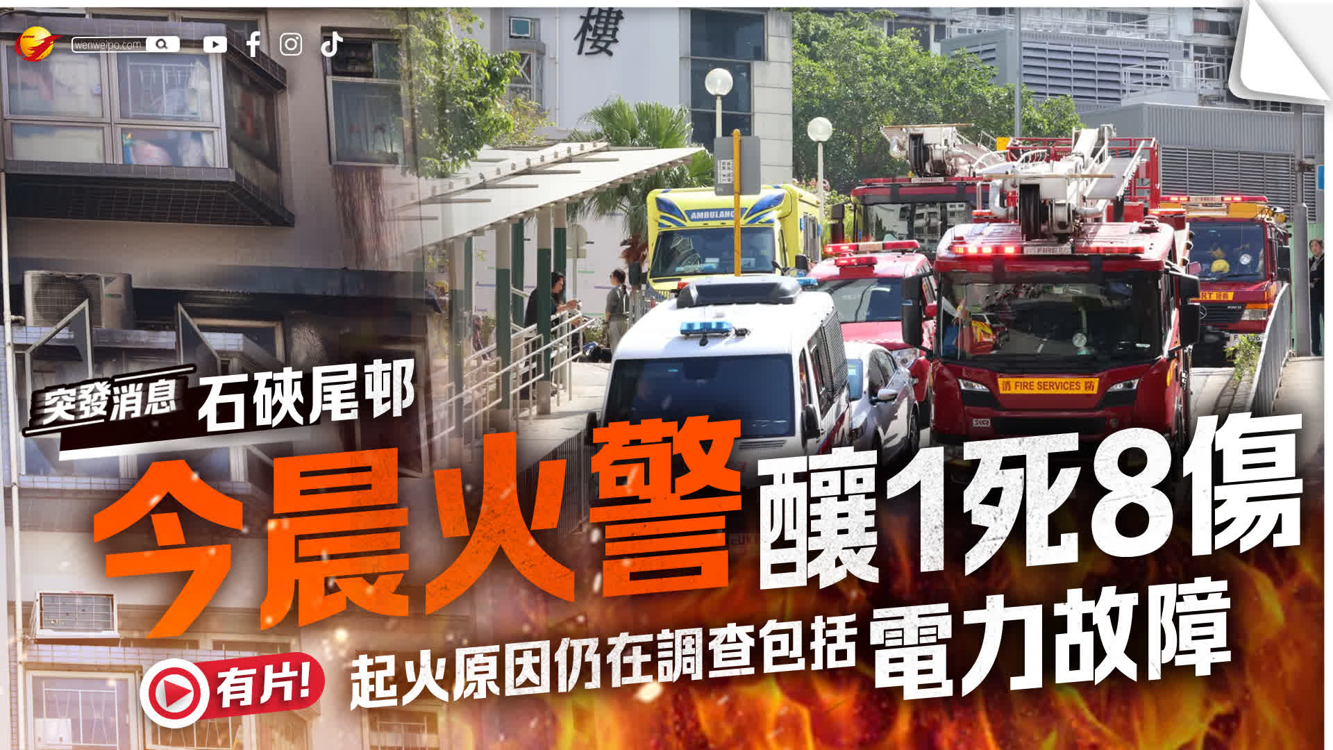 香港文匯報訊(記者 蕭景源)石硤尾邨今晨(4日)火警釀1死8傷,初步不排除是充電器短路起火導致火警。署理助理消防區長葉錦江表示,消防處於今日上午8時01分接報,指石硤尾邨美如樓21樓一個單位發生火警,火警發生後,消防員約4分鐘後到達現場,期間,消防處共調派13輛消防車、13輛救護車,共出動91名消防及救護人員,共動用一條喉及一隊煙帽隊進行灌救及搜救。