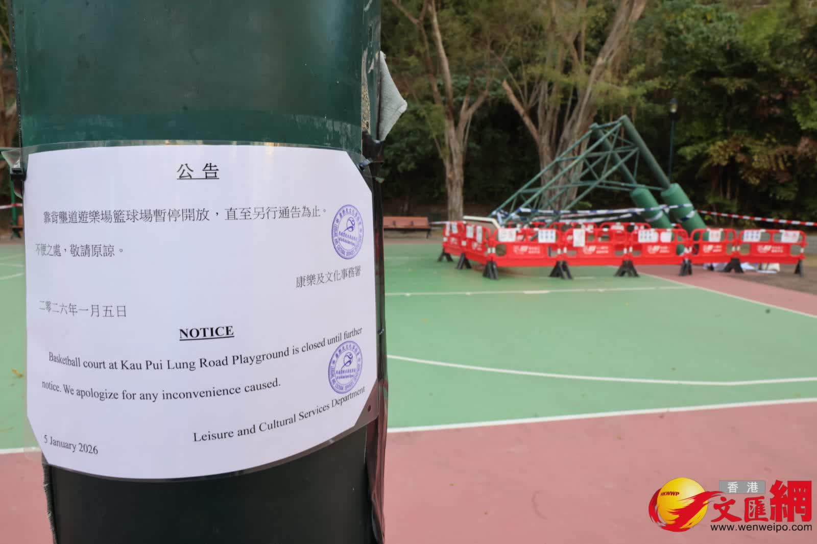 香港文匯報訊(記者 蕭景源)土瓜灣靠背壟道遊樂場昨晚(4日)有籃球架倒塌壓傷一名青年送院,初步相信是籃球架支柱嚴重鏽融老化致塌下。康文署今日(5日)回覆傳媒查詢指高度關注意外,向傷者表示慰問。又指意外後已即時圍封整個籃球場,並安排相關工程人員了解及跟進事故。