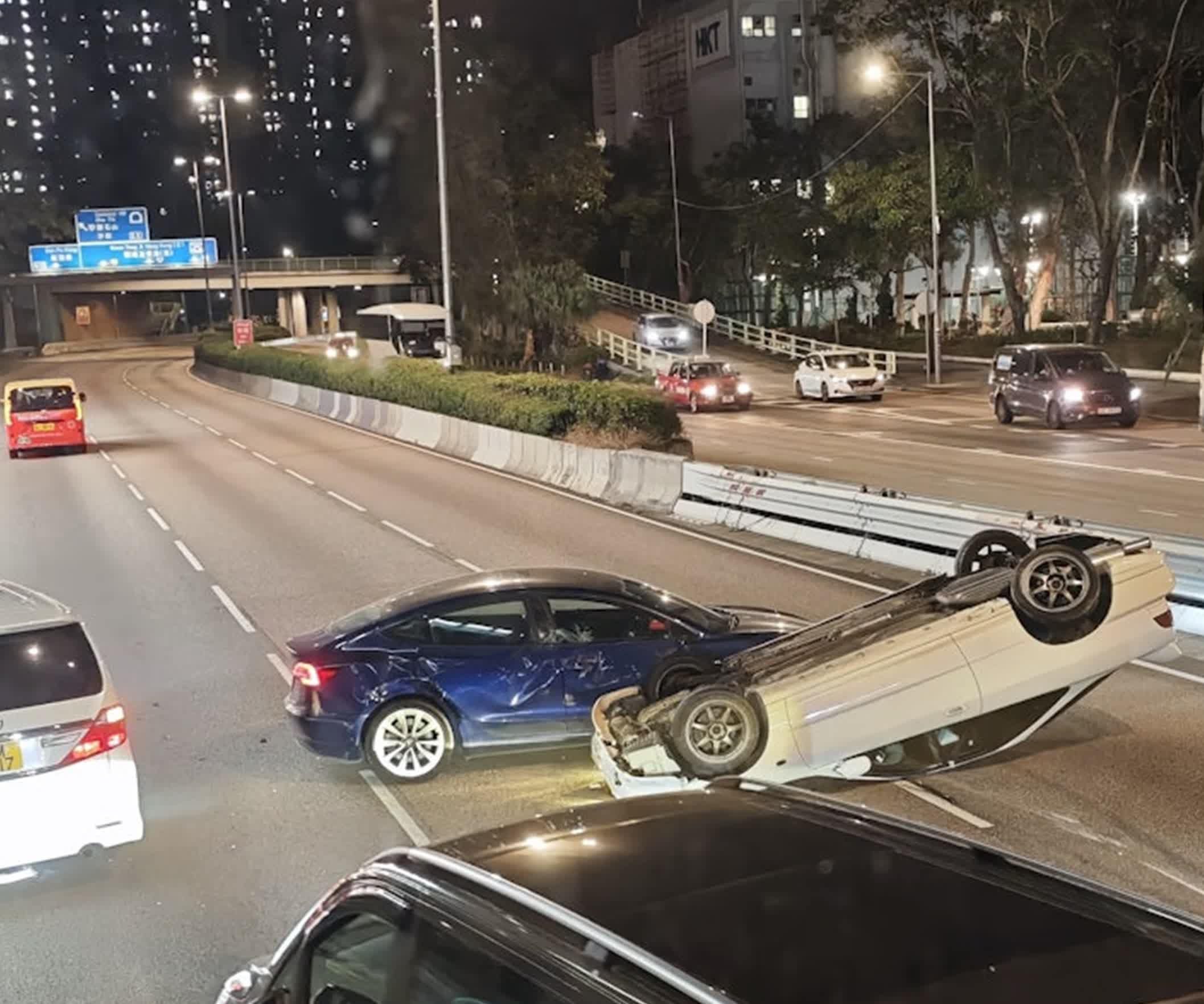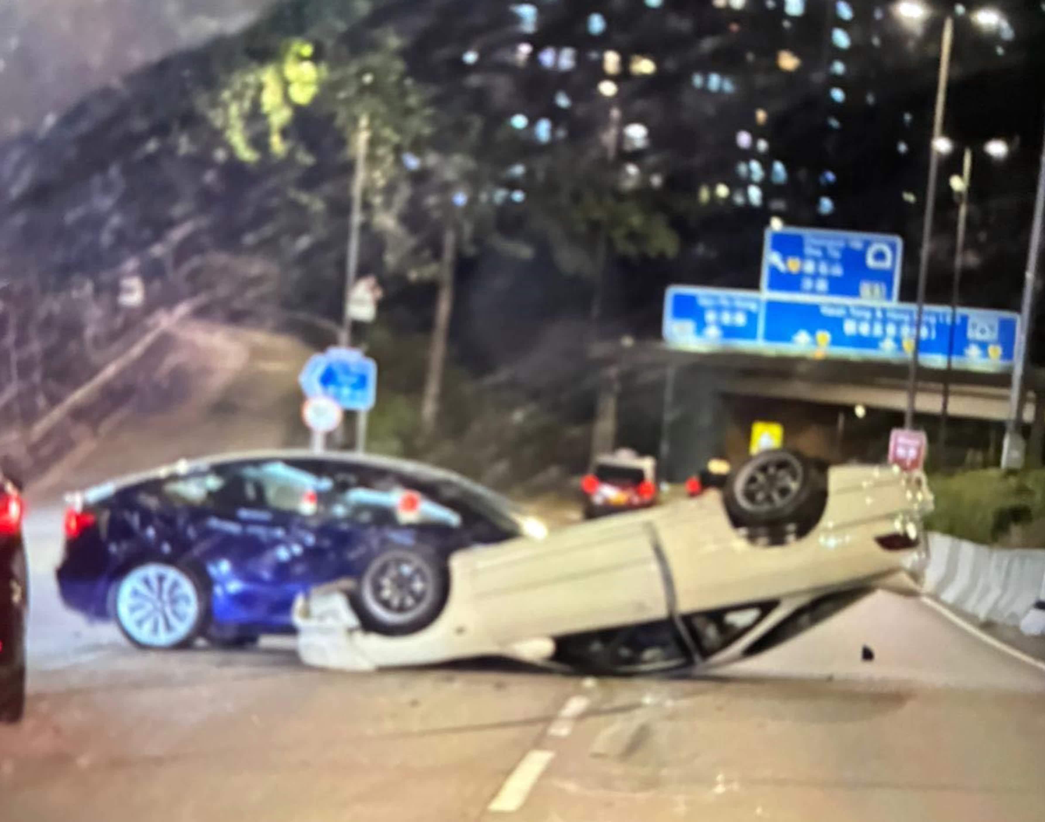網上片段所見,翻轉的白色私家車車內安全氣囊彈出,藍色私家車右邊車身凹陷,車窗破裂。受意外影響,現場交通受阻。警方現正調查意外原因。