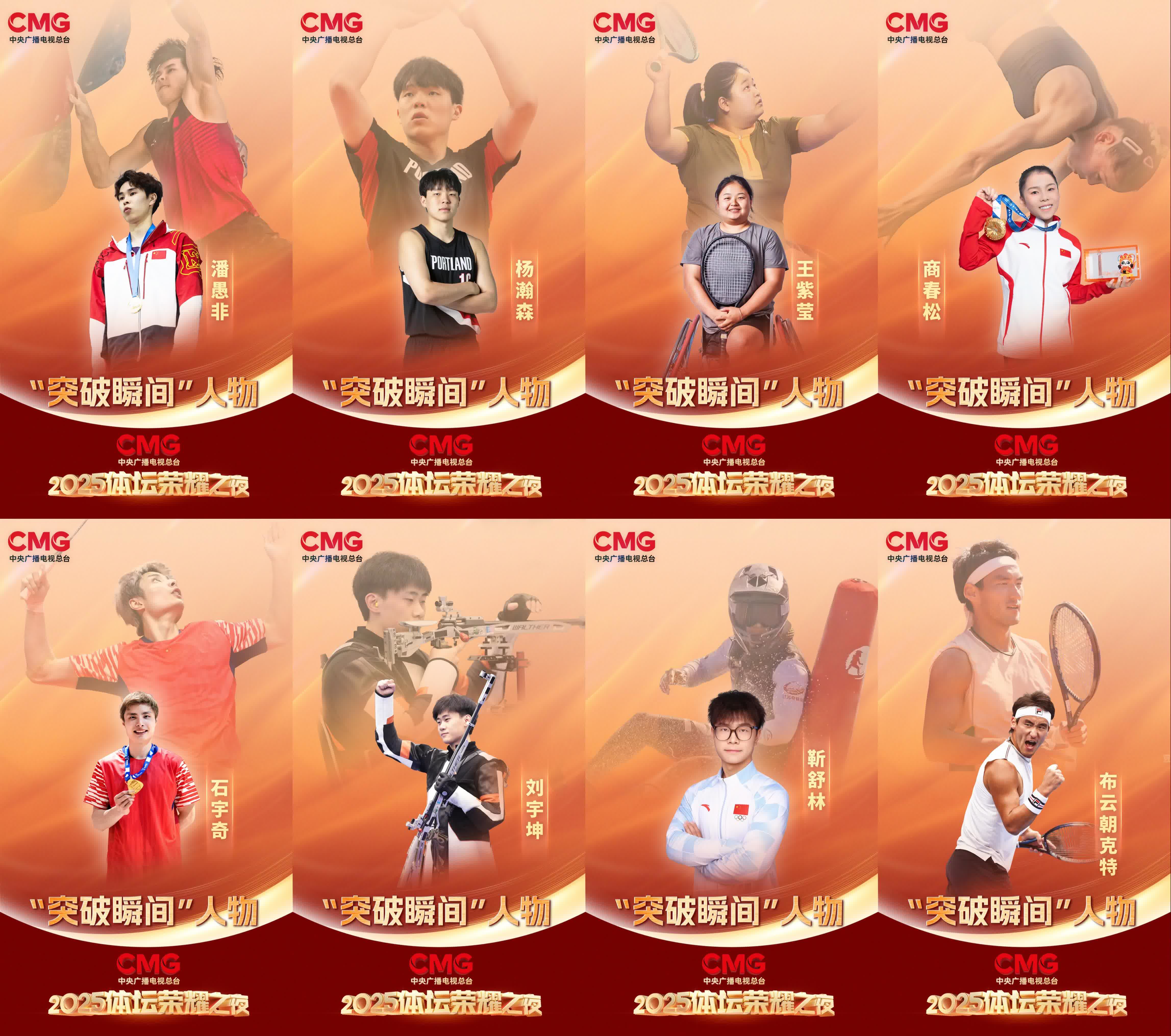 「突破瞬間」榮譽頒給在2025年實現里程碑式跨越的運動員。攀岩世界盃伯爾尼站攀石冠軍潘愚非、加盟美職籃的楊瀚森、溫網輪椅網球女單冠軍王紫瑩、成都世運會跑酷女子自由式冠軍商春松、羽毛球世錦賽男單冠軍石宇奇、全運會射擊冠軍劉宇坤、世界動力衝浪板錦標賽總決賽冠軍靳舒林、澳網亞太區外卡賽冠軍布雲朝克特獲評「突破瞬間」人物。