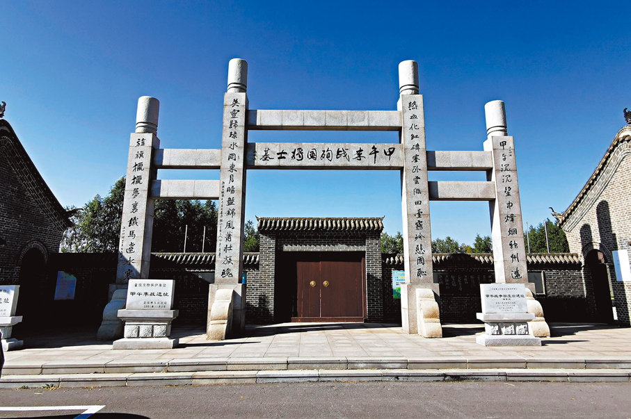 清軍陣亡將士墓原為三處,分別在保靈宮西、白家屯北和東河沿木器廠附近。因年代久遠,有兩處墓地今已無法尋覓其確切位置,能夠確認的只有保靈宮西的清軍墳。該遺址原有土墓一座,青石碑一塊,均已湮沒不見。這裏現已建起甲午末戰殉國將士墓。走進墓園,我們的視線就被牌樓上的兩副對聯吸引住了——主聯:「熱血化紅磷塞外雲低田台霧冷悲國恥;英靈歸綠水關東月暗盤錦風蕭壯族魂」,副聯:「甲午沉沉望中烽煙神州遠;旌旗獵獵夢裏鐵馬遼水寒」。對聯以高度凝練的語言概括了那段屈辱的歷史,更彰顯清軍將士的英勇不屈,讓人瞬間熱血沸騰。