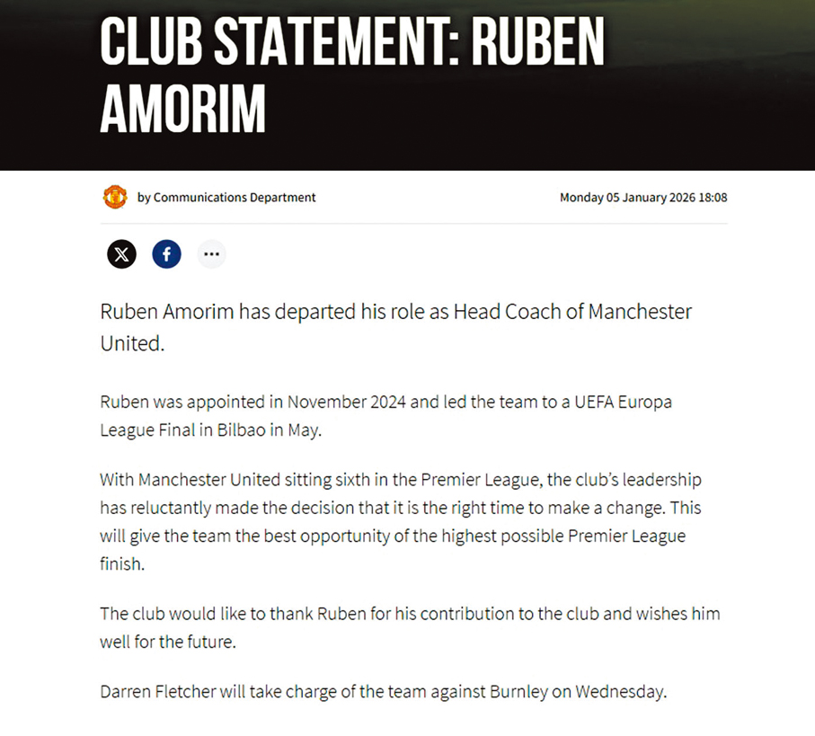曼聯在新一年首場英超賽事延續近期頹勢,作客以1:1 僅和列斯聯,近五場聯賽第四度失分。除了主帥艾摩廉的排陣惹人非議,他賽後的言論明顯與管理層關係惡化,而曼聯亦於昨晚宣布辭退這位葡萄牙籍主帥。