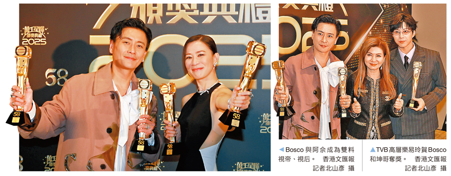 香港文匯報訊(記者 達里)TVB年度盛事《萬千星輝頒獎典禮2025》前晚在澳門舉行,黃宗澤(Bosco)與佘詩曼(阿佘)拿下「最佳男、女主角」兼得「大灣區最喜愛TVB男、女主角」,成為雙料視帝、視后。曾志偉獲頒新加設的獎項「萬千星輝榮譽傳奇大獎」,他從好友譚詠麟手上接過獎項,也隨即宣布辭任TVB總經理一職,未來會擔任諮詢委員會召集人,繼續為TVB獻計。志偉坦言辭任TVB總經理一職已思考良久,更需要五度請辭才成功,而未來他將會回歸為影圈出分力。