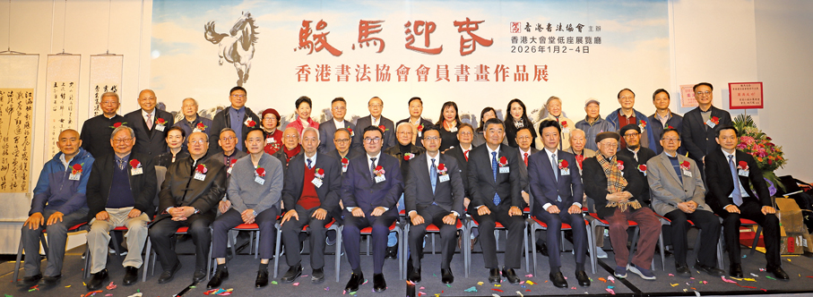 1月3日,香港書法協會假中環愛丁堡廣場五號香港大會堂舉行「駿馬迎春,香港書法協會會員書畫作品展」。活動邀得大紫荊勳賢、中國書協香港分會主席施子清,中國硬筆書法協會名譽主席、香港大書法協會主席張華慶,港區全國人大代表、香港工會聯合會會長吳秋北,全國政協委員、香港江蘇社團總會會長姚茂龍,全國政協委員,漢榮書局有限公司董事長石漢基,中國書協會員、中國書協香港分會顧問李大洲,中國硬筆書法協會黨組書記、會長李冰,香港蘭亭學會主席、香港書法協會名譽會長李錦賢,前香港立法會議員、香港書法協會名譽會長王國興,香港註冊中醫學會副會長、香港書法協會名譽會長顏培增,中國書法家協會理事、香港書法協會顧問容浩然,中國書協香港分會副主席、香港書法協會顧問馬潤憲,香港書法學院院長、中國書協香港分會顧問岑寂秋,香港草書書法院院長、香港書法協會顧問吳任,香港書法家協會會長方志勇,香港書法協會會長、中國書協香港分會副主席馮萬如等出席並主禮,場面熱鬧。