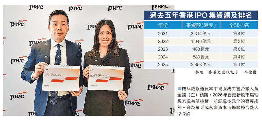 美國無視別國主權入侵委內瑞拉,加劇全球地緣政局風險,香港的全球資金避風港地位日益重要,不少巨型企業加緊來港上市。羅兵咸永道昨日發表的香港IPO回顧及展望指出,隨着今年美聯儲有望繼續減息,在高端製造和科技公司上市的推動下,預期2026年香港新股市場表現更上一層樓,全年將有約150家企業上市,按年再增26%,集資額有望增至最多3,500億元,按年升22%,包括3隻至5隻集資額達100億元的大型新股,總集資額有望繼續排名全球首三位。