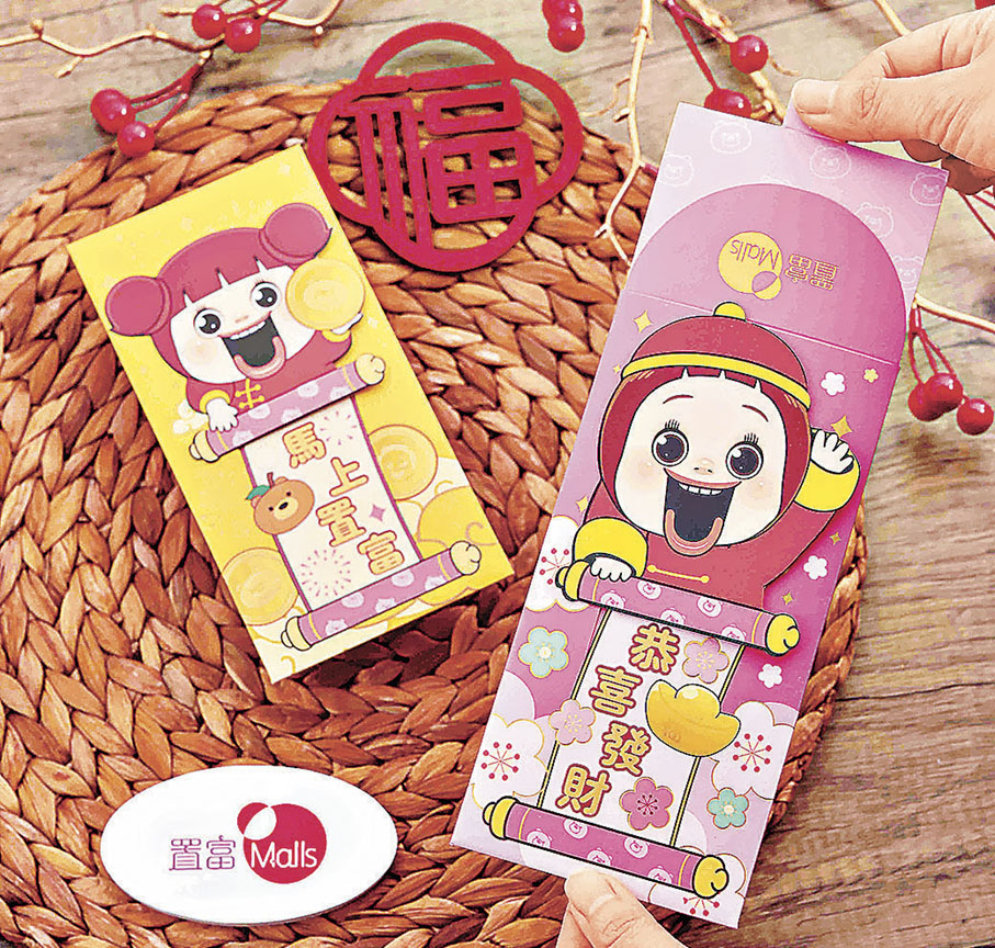 顧客只要於1月17日起,在置富Malls旗下商場消費滿指定金額,即可換領利是封套裝乙套,每套兩款共8個利是封,數量有限,換完即止。