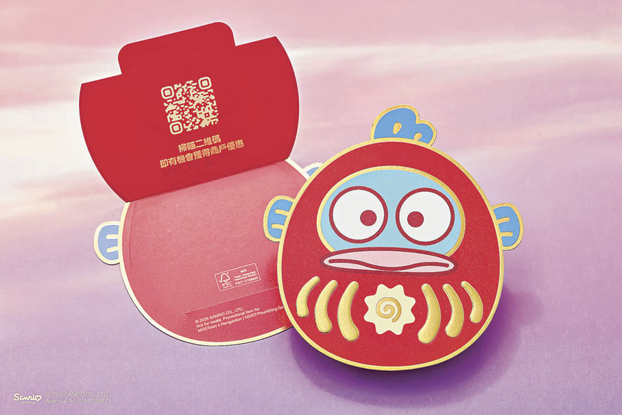 位於馬鞍山的MOSTown新港城中心首次聯乘Sanrio角色HANGYODON,呈獻全港首次亮相的新春限定主題商場裝置「MOSTown新港城中心✕HANGYODON風生『水』起花庭園」。場內將設置4款HANGYODON和風新年造型在花庭園驚喜亮相,與市民暢遊4大主題打卡區及2大互動玩樂區,並設有「HANGYODON新春期間限定店」,為大家帶來福氣滿盈的賀年體驗。農曆新年最令人期待的,莫過於象徵福氣、財氣滿滿的利是。MOSTown新港城中心聯乘HANGYODON獨家推出兩款限量別注版利是封套裝「如『魚』得水賀年套裝」及「風生『水』起尊貴賀年套裝」(各每盒8個利是封)。笑口常開的HANGYODON換上新春達摩造型亮相,向親朋好友傳遞好運祝福,願大家馬年福氣滿盈、財運亨通,順風順水!各利是封內頁更印有期間限定商戶禮遇二維碼,大家只需用手機輕鬆掃描,即有機會獲取商戶新春優惠,盡享商場內的餐飲及潮流生活等消費樂趣,齊齊豐衣足食迎新歲!