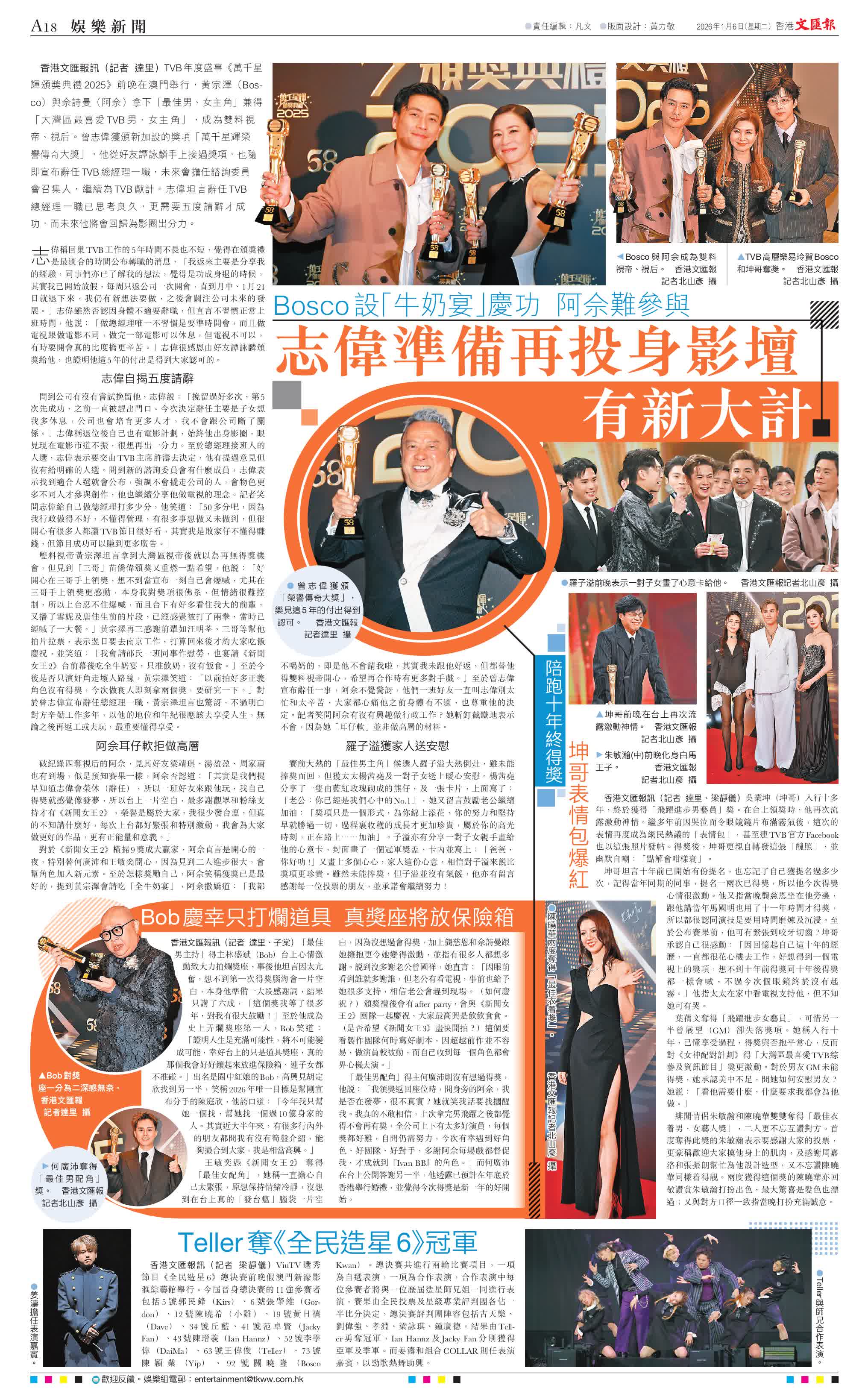 香港文匯報訊(記者 達里、子棠)「最佳男主持」得主林盛斌(Bob)台上心情激動致大力拍爛獎座,事後他坦言因太亢奮,想不到第一次得獎腦海會一片空白,本身他準備一大段感謝詞,結果只講了六成,「這個獎我等了很多年,對我有很大鼓勵!」至於他成為史上弄爛獎座第一人,Bob笑道:「證明人生是充滿可能性,將不可能變成可能,幸好台上的只是道具獎座,真的那個我會好好鑲起來放進保險箱,連子女都不准碰。」出名是圈中紅娘的Bob,高興見胡定欣找到另一半,笑稱2026年唯一目標是幫剛宣布分手的陳庭欣,他誇口道:「今年我只幫她一個找,幫她找一個過10億身家的人。其實近大半年來,有很多行內外的朋友都問我有沒有筍盤介紹,能夠撮合到大家,我是相當高興。」