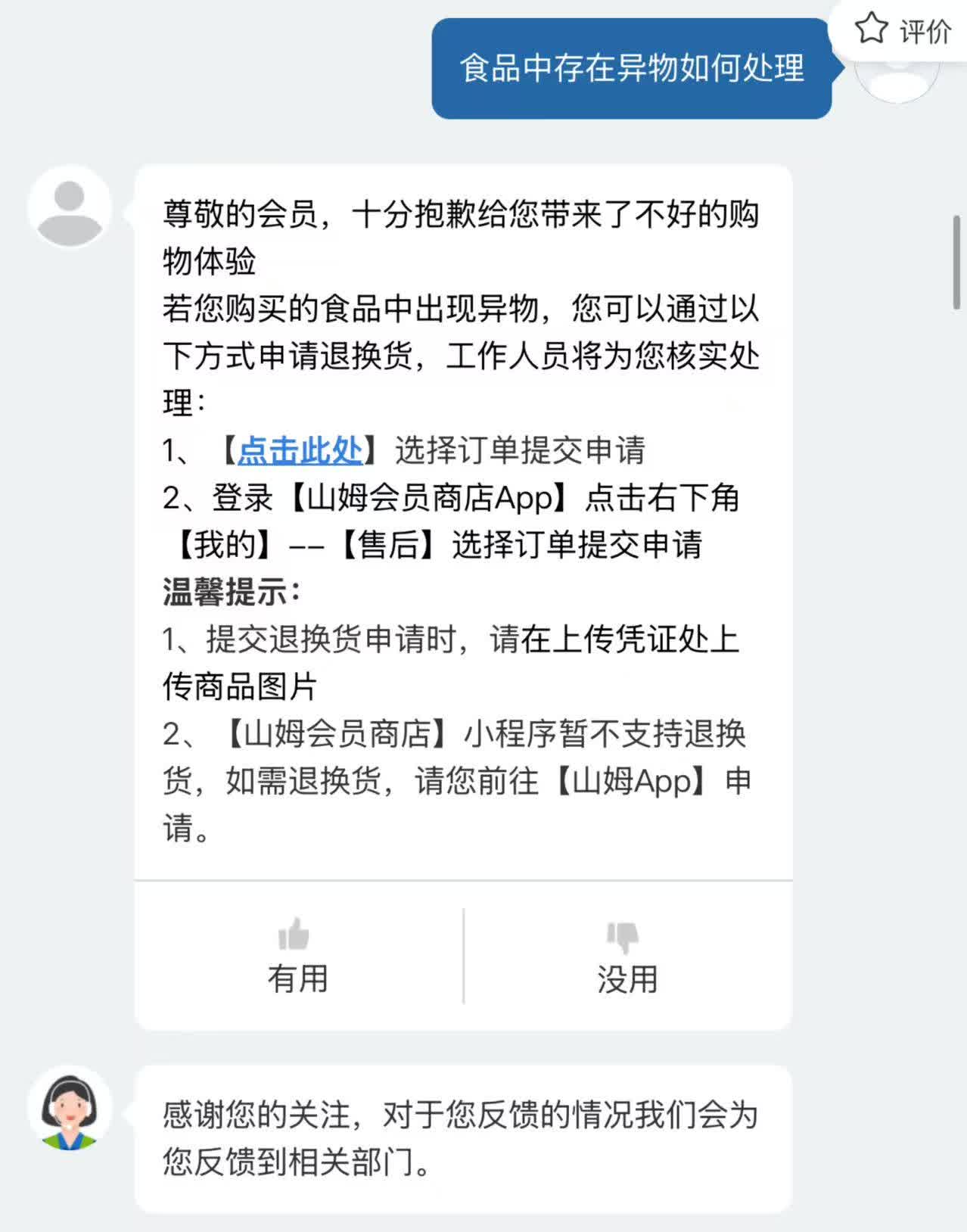 此外,山姆會員商店APP機器人客服提供的信息顯示,若購買的食品中出現異物,可以在山姆會員商店APP中申請退換貨,工作人員將核實處理。