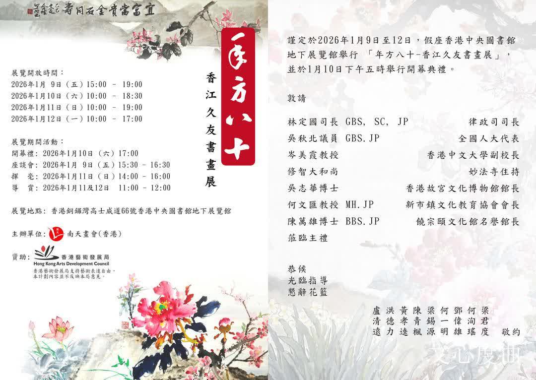 時值2026年,九友皆將步入耄耋之年,然藝心未老,反添醇熟,故特以「年方八十」為題,舉辦書畫聯展。此展不僅為藝壇盛事,亦展現香港文化界「老驥伏櫪,志在千里」之精神風貌。展覽將於1月9日下午在香港中央圖書館開幕,並設座談會,九位藝術家將共話藝途,分享數十載翰墨心得。